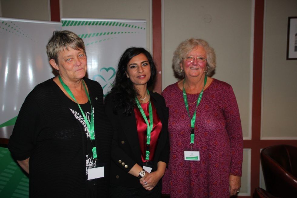 GOD INNSATS: Inger Johanne Nordås fra Tokerudberget har vært med i Senterpartiet siden midten av 90-tallet og Inger Bigum fra Vestli har vært med siden 2005. I år tok de turen til partiets valgvake for første gang. Her står de sammen med Aisha Naz Bhatti (midten). Foto:Bilde 1 av 2