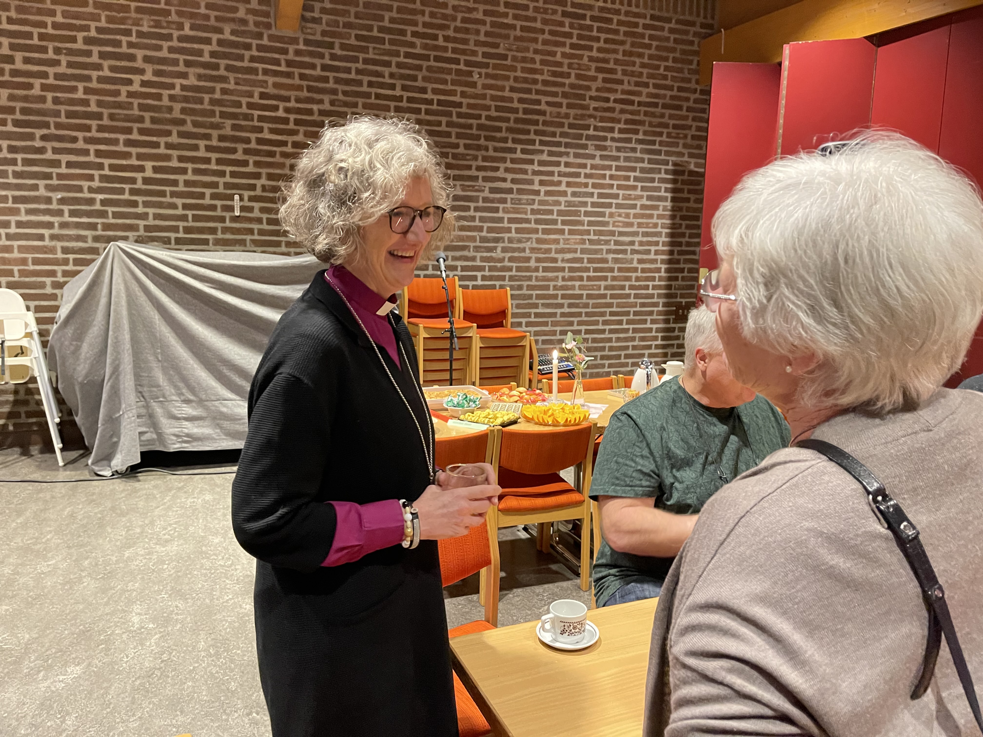 HYGGELIG BESØK: Biskop Kari Veiteberg hilste på absolutt alle som var på åpen dag i Stovner kirke. Det var et godt oppmøte, fine taler og mye god mat fra forskjellige deler av verden. Bilde 1 av 2