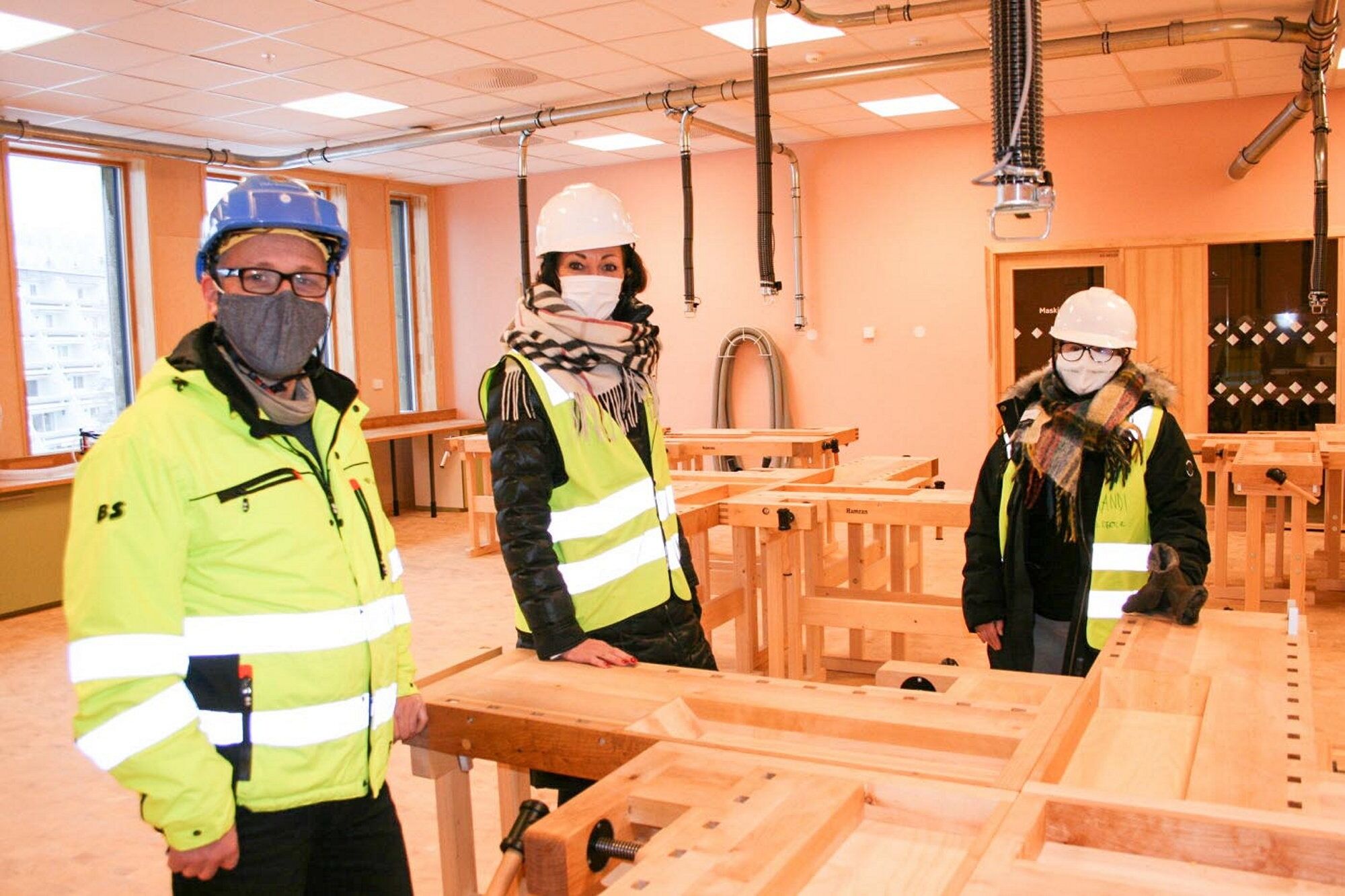 FORTSATT BYGGEPLASS: De siste detaljene ble finpusset da avisa dro på befaring med assisterende rektor Randi Sømo (f.v.), prosjektleder Roar Pedersen og rektor Ellen Sundby på onsdag.