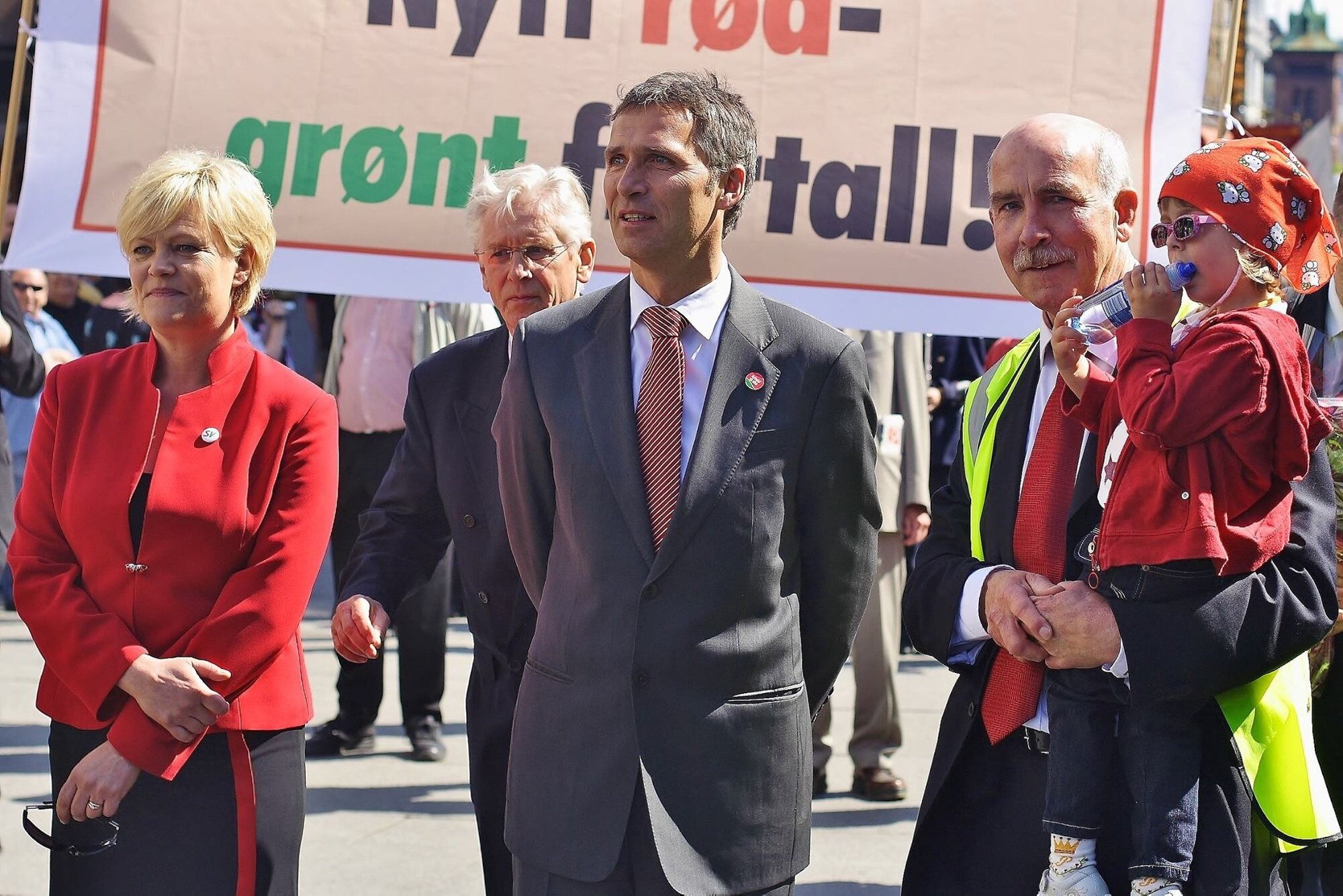 Steinar Saghaug i kjent 1. mai-stil i front av toget. Her med Kristin Halvorsen, Jens Stoltenberg, og ikke minst barnebarnet Mia - som i ettertid alltid har sagt at hun kjenner Jens og Kristin. Den typen fellesskap mener Steinar kjennetegner 1. mai-toget. (Foto: Privat) Foto:Bilde 1 av 2