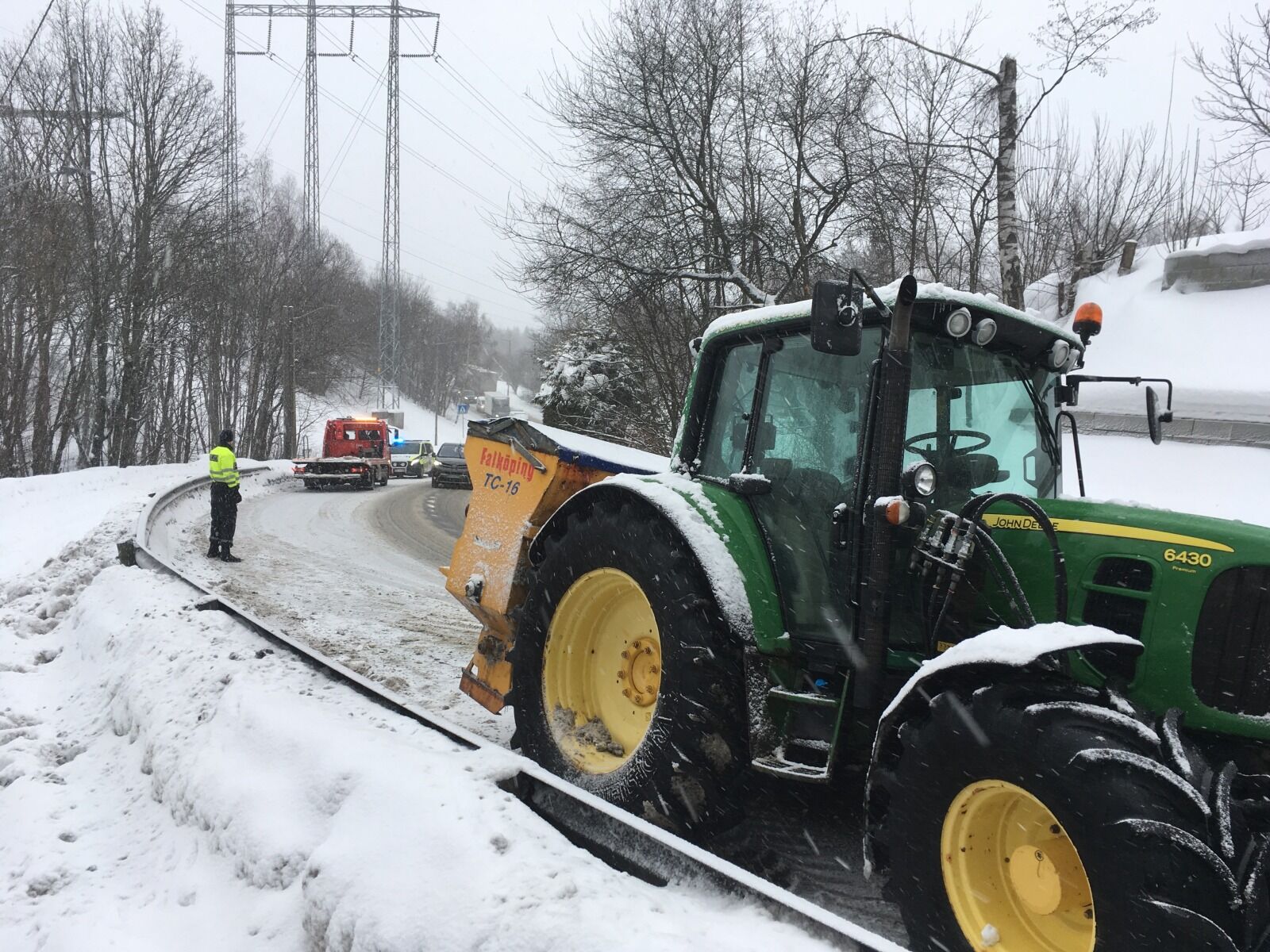 Traktoren ble tatt med av bergingsbilen og veien er ryddet for normal trafikk.