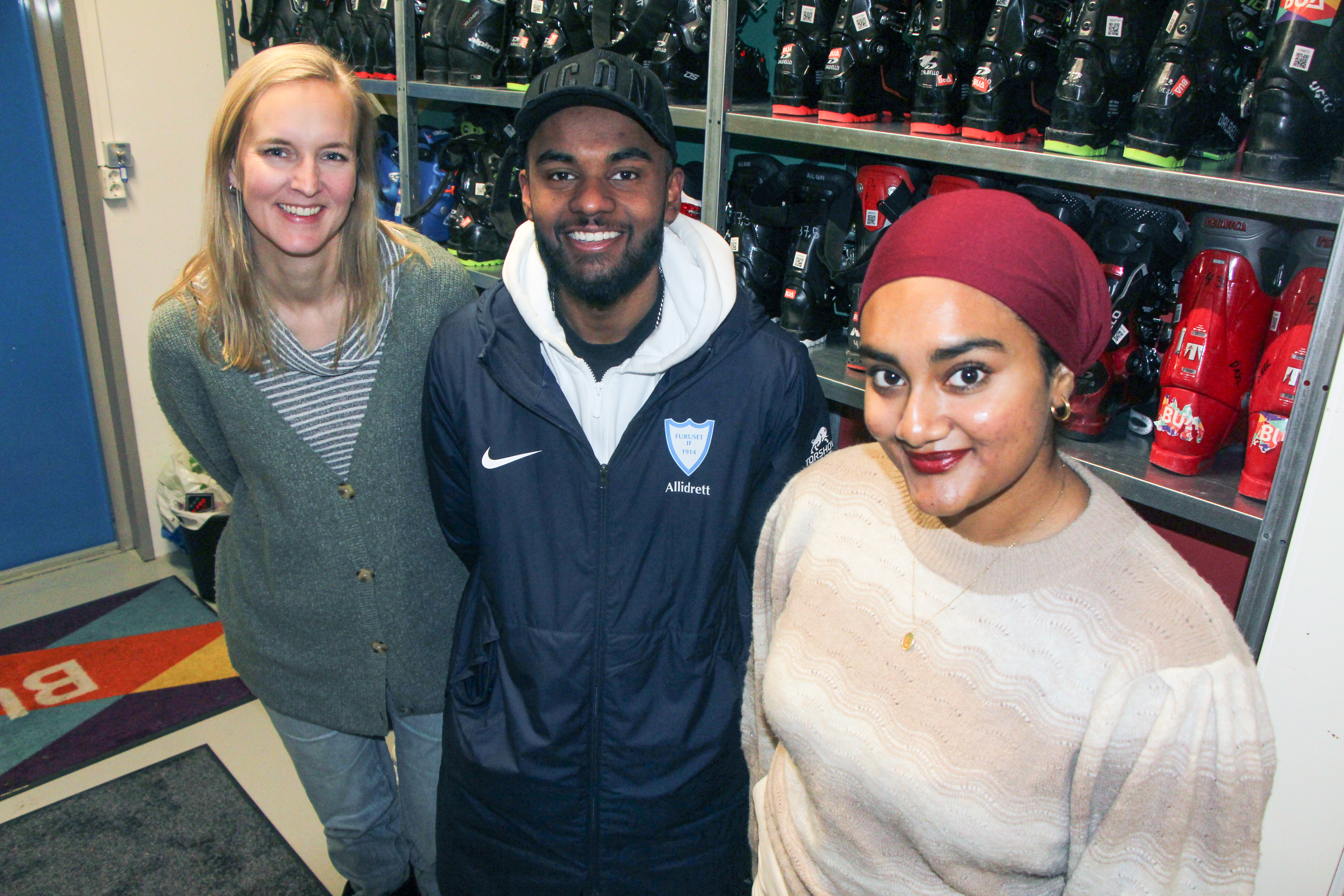 BUA FURUSET: Utlånssentralen er med på å legge til rette for at enda flere kan ta del i aktiviteter og idrett. Det vil Arbeiderpartiet ha enda mer av og vil stemme for ytterligere 400.000 kroner i Oslo-budsjettet til BUA. Her med fungerende daglig leder Vibeke Saarem (f.v), Athithyan Valluvan på BUA på Furuset, og bystyrerepresentant for Arbeiderpartiet, Tamina Sheriffdeen Rauf. FOTO: Sindre Veum Apneseth