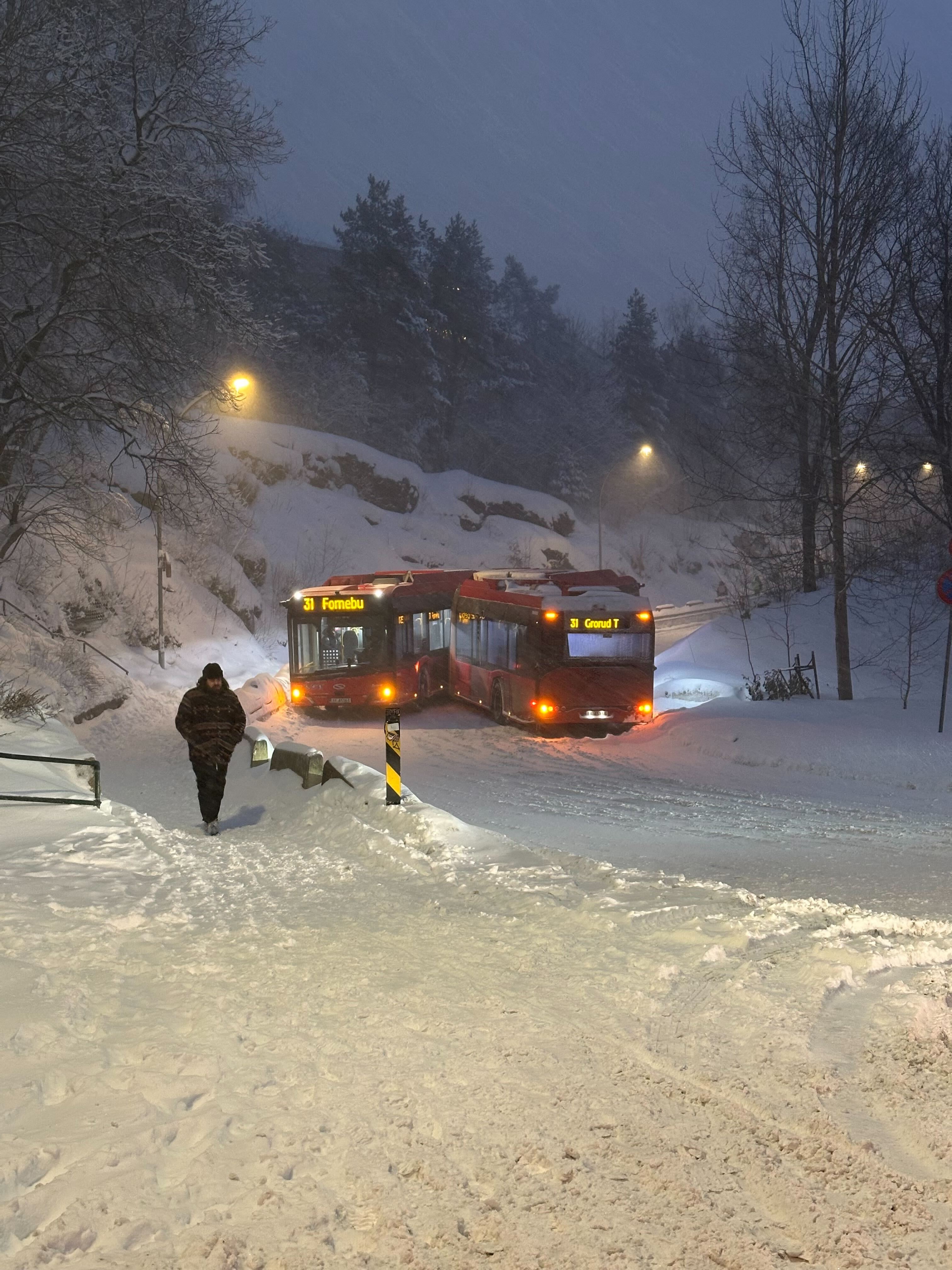 Det er to busser på linje 31 som har kollidert med hverandre i Rødbergveien. Veien er kjent for å være krevende for busser på vinterstid og det har vært flere ulykker i samme område hittil i vinter. Linje 31 er innstilt inntil videre.