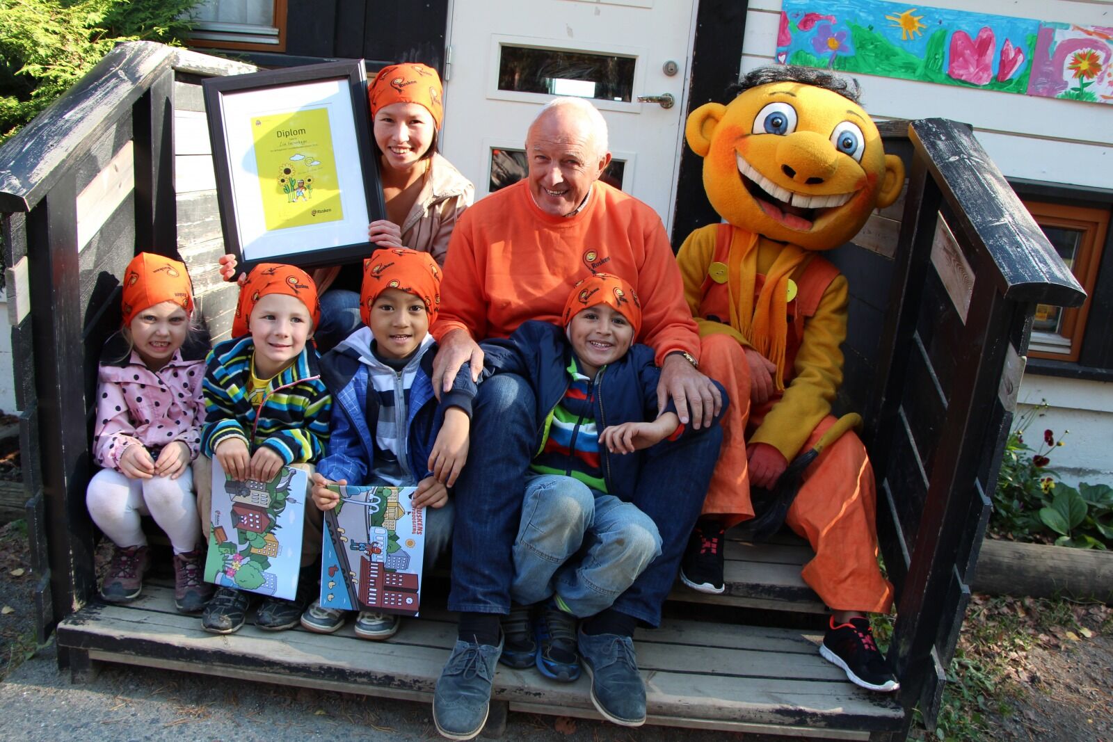 GRØNNE FINGRE: Lia barnehage utmerker seg i Ruskens ferske solsikke-konkurranse. Her mottas premien av femåringene Vilde (f.v.), Jonas, Tony, Adam og barnehagens avdelingsleder, Le Hang Pham. Ruskengeneral Jan Hauger tok med seg Rusken-maskoten for anledningen Foto: Caroline BremerBilde 1 av 2