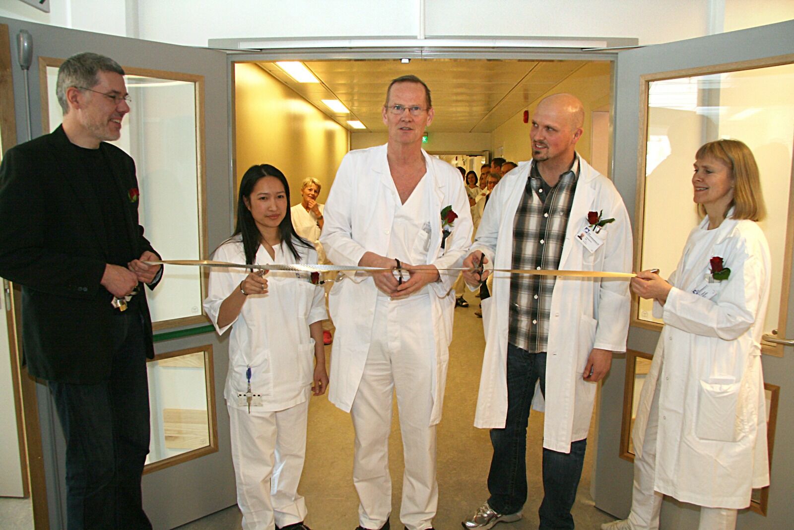 Foto fra åpningen av Aker sykehus’ nye infeksjonspost – 8. februar 2010. Artikkelen sto i avisen to dager senere. I medfølgende bildetekst står det: Tina Nguyen, Dag Berild og Odd Rønningsveen klippet snora for den nye infeksjonsposten. Vidar Ormåsen og Bente Bergersen holder snora. Foto:Bilde 1 av 1