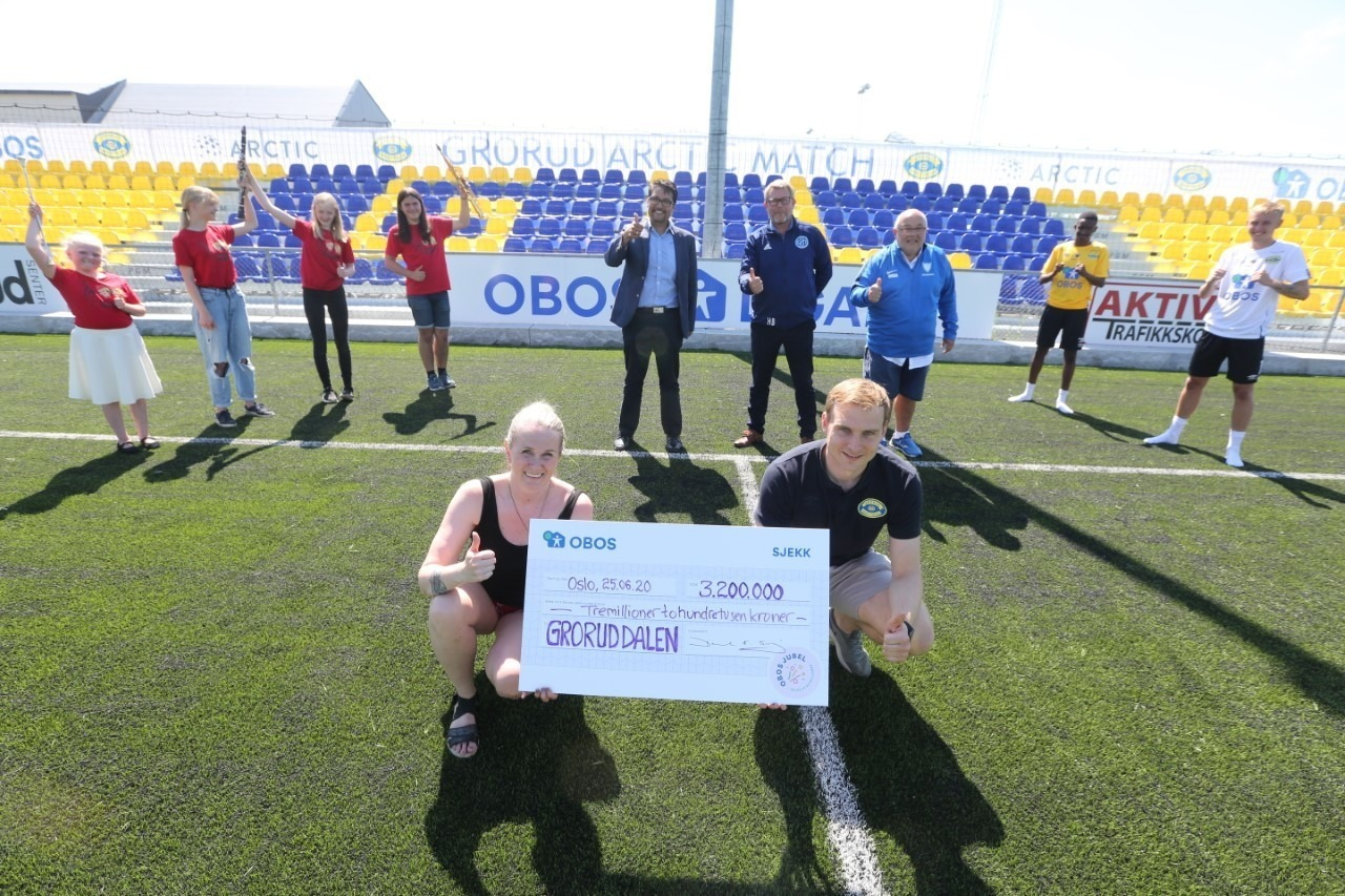 GLADE MOTTAKERE: Drillmamma Anett Reinholtsen i Grorud skoles Musikkorps og daglig leder i Grorud IL, Jon Ole Reinhardsen, med den symbolkse sjekken som viser totalsummen OBOS gir til Groruddalen - 3,2 millioner. m Bak står konsernsjef i OBOS, Daniel Kjørberg Siraj (f.v.), Håvard Brasrudhaget fra Høybråten & Stovner IL og Vidar H. Noreng fra Furuset IL. Embla, Eskil, Maja og Cornelia fra musikkorpset, samt Grorud-spillerne Saadiq Faisal Elmi og Elias Kristoffersen Hagen er med på jubelen Foto:Bilde 1 av 1