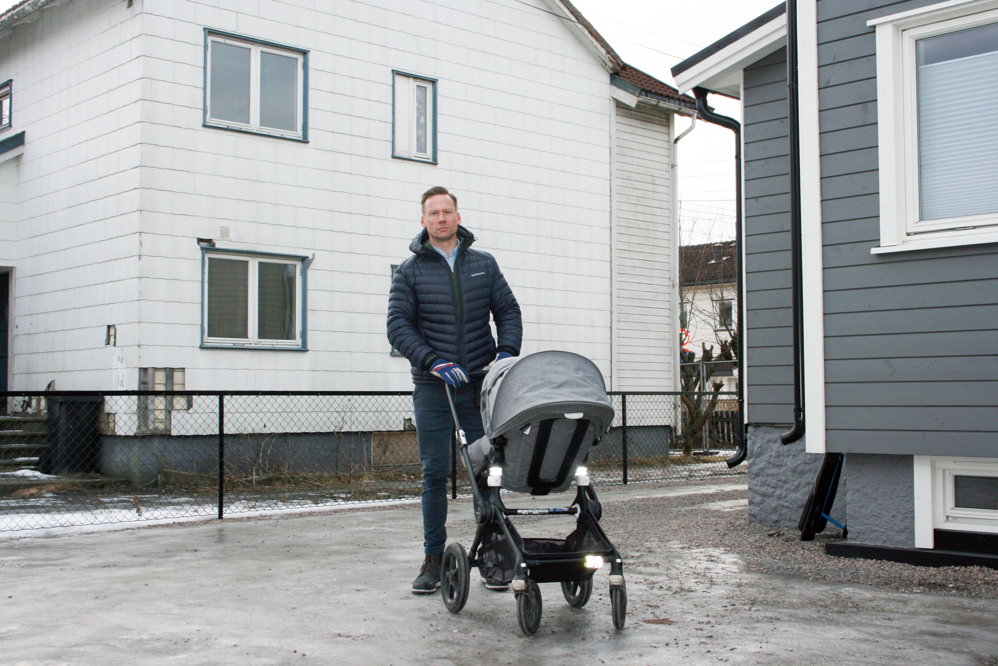 FRUSTRERT: Øyvind Fjære-Lindhjem ser rett på bygget fra kjøkkenvinduet. Han vil ha en fortgang fra det offentlige, slik at eiendommen igjen kan bli tatt i bruk. Asbestplatene på utsiden av huset har begynt å falle av, og med to små barn bekymrer han seg over langsomheten. Bilde 1 av 3