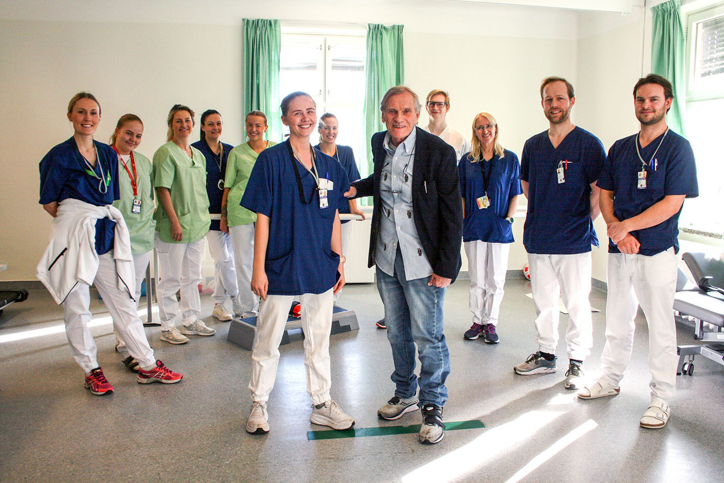 Bjørn Gjellum (foran, til høyre) mistet funksjon i bein og arm da han fikk hjerneblødning. Onsdag takket han de ansatte på forsterket rehabilitering p Aker sykehus for at han i dag kan gå igjen. Foto: Caroline HammerBilde 1 av 1