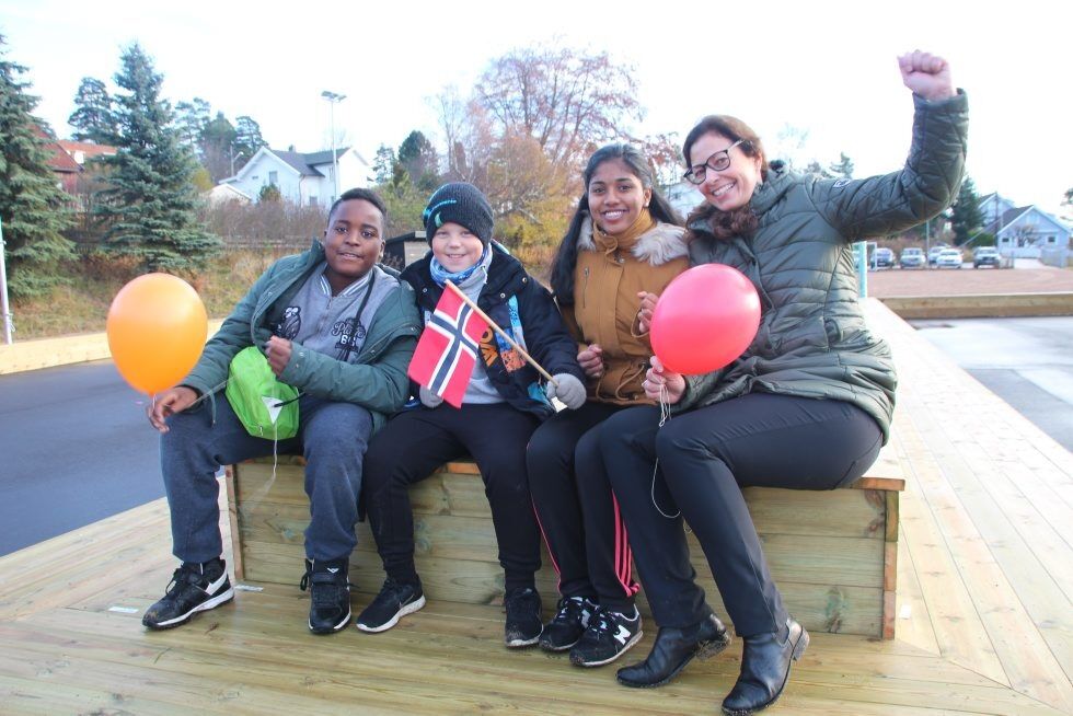 STORT OMRÅDE: Will (11), Mathias (11), Saambavi (12) og rektor Mona Mohn gleder seg til å se mye aktivitet både ned i skolegården og på ballbanene på Lille Grei. Foto:Bilde 1 av 4