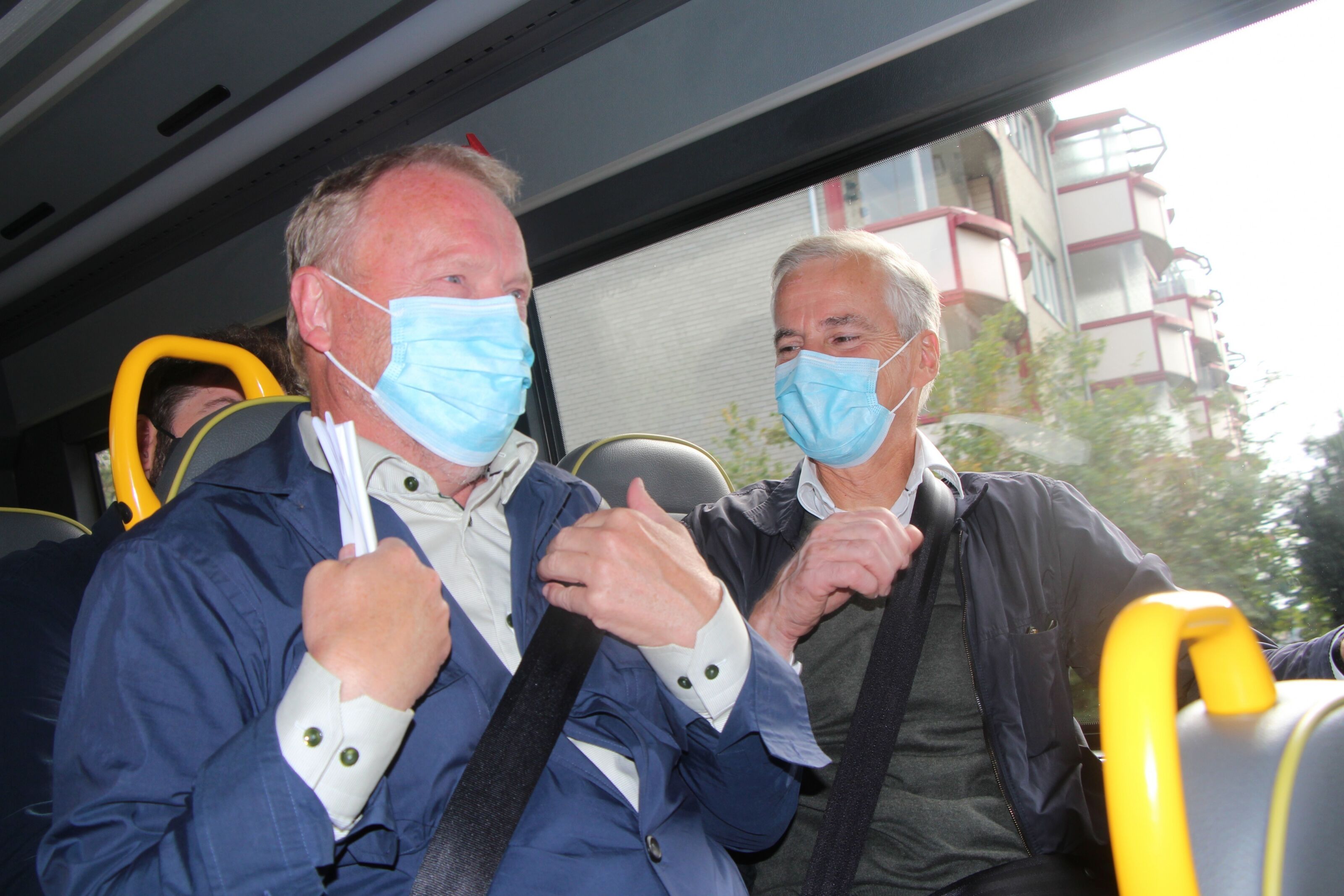 PÅ MED MUNNBINDENE: Det er igjen påbud om bruk av munnbind, blant annet i kollektivtrafikken. Her Raymond Johansen og Jonas Gahr Støre under lanseringen av Rosa Busser tidligere i år. Foto:Bilde 1 av 1 Dette er gjeldende regler og anbefalinger Caroline Hammer Publisert 2. des 21 kl. 15:50 Del på sosiale medier Del Facebook Twitter E-post Nyhetsbrev Facebook Instagram Abonnement
