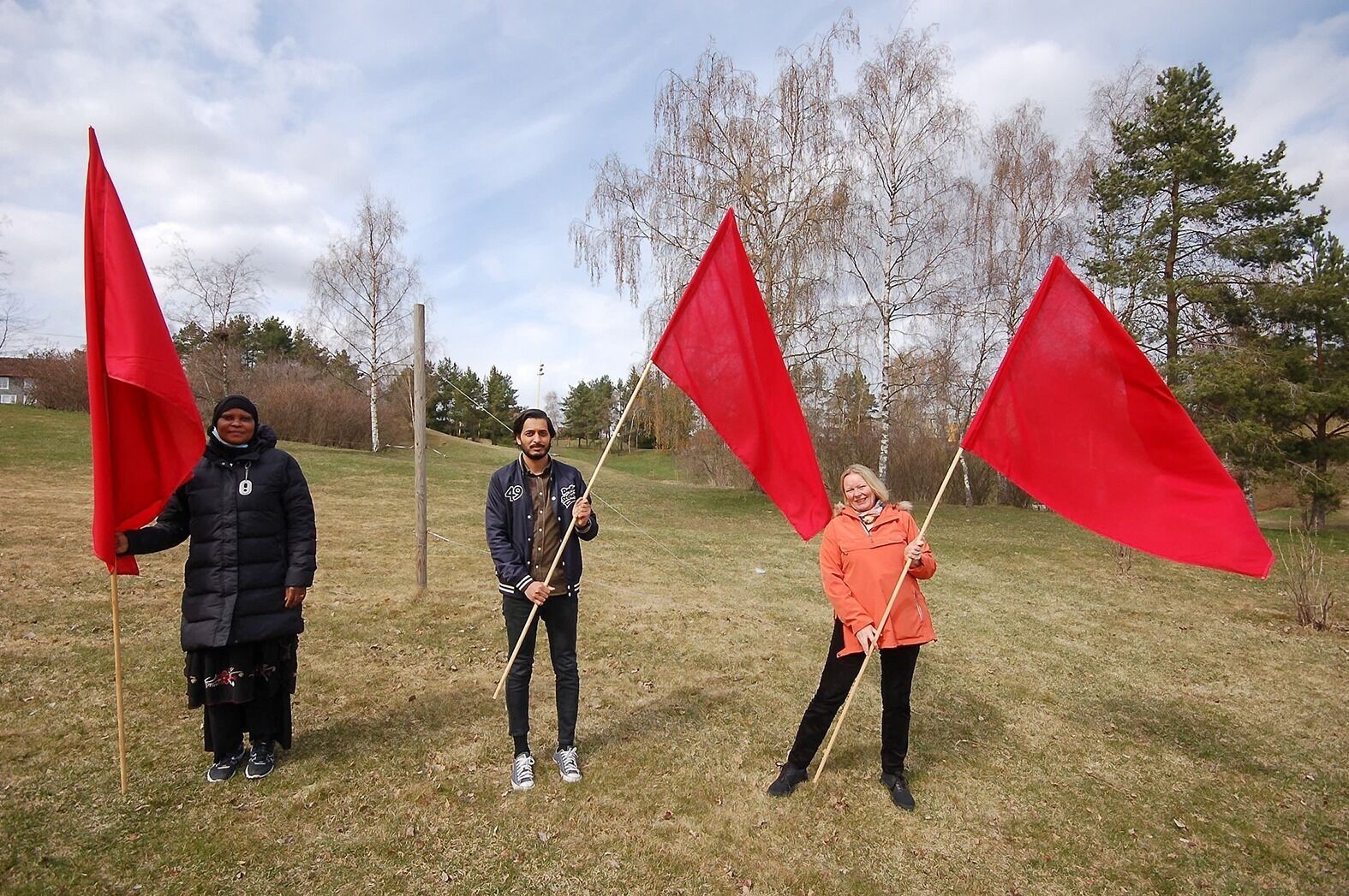 Hensikten med dette, enkle, improviserte møtet med god koronaavstand, er ikke bare å snakke om 1. mai-programmet, men også kort å dvele ved de parolene Rehema, Farukh og Ingunn kan tenke seg å gå under i toget.