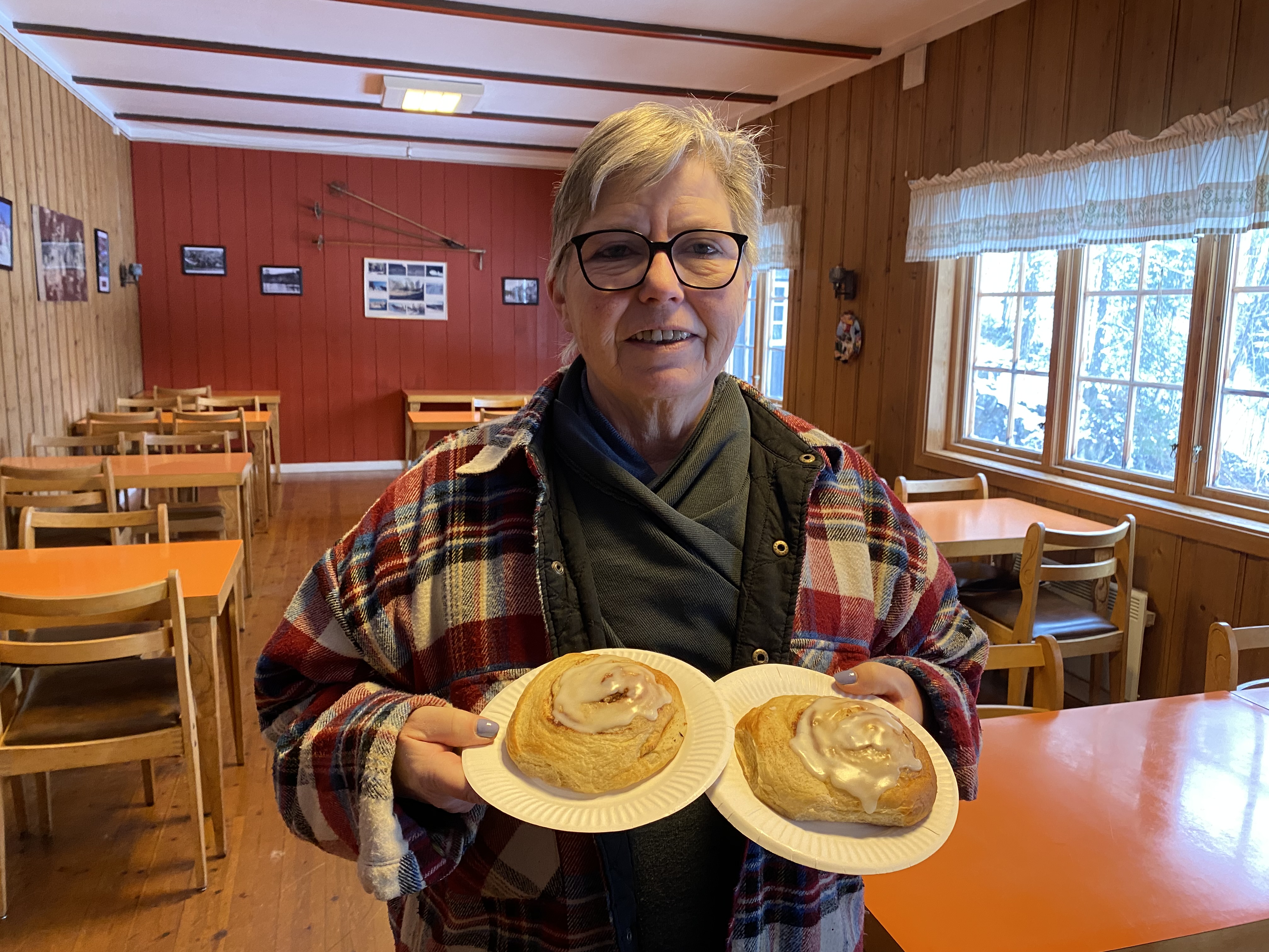 Markastue-bestyrer Dorthe Nygaard ønsker alle velkommen til Linderudkollen sportsstue denne påsken. Journalist Sindre slukte en tilsvarende bolle som på bildet før noen visste ordet av det.Bilde 1 av 1