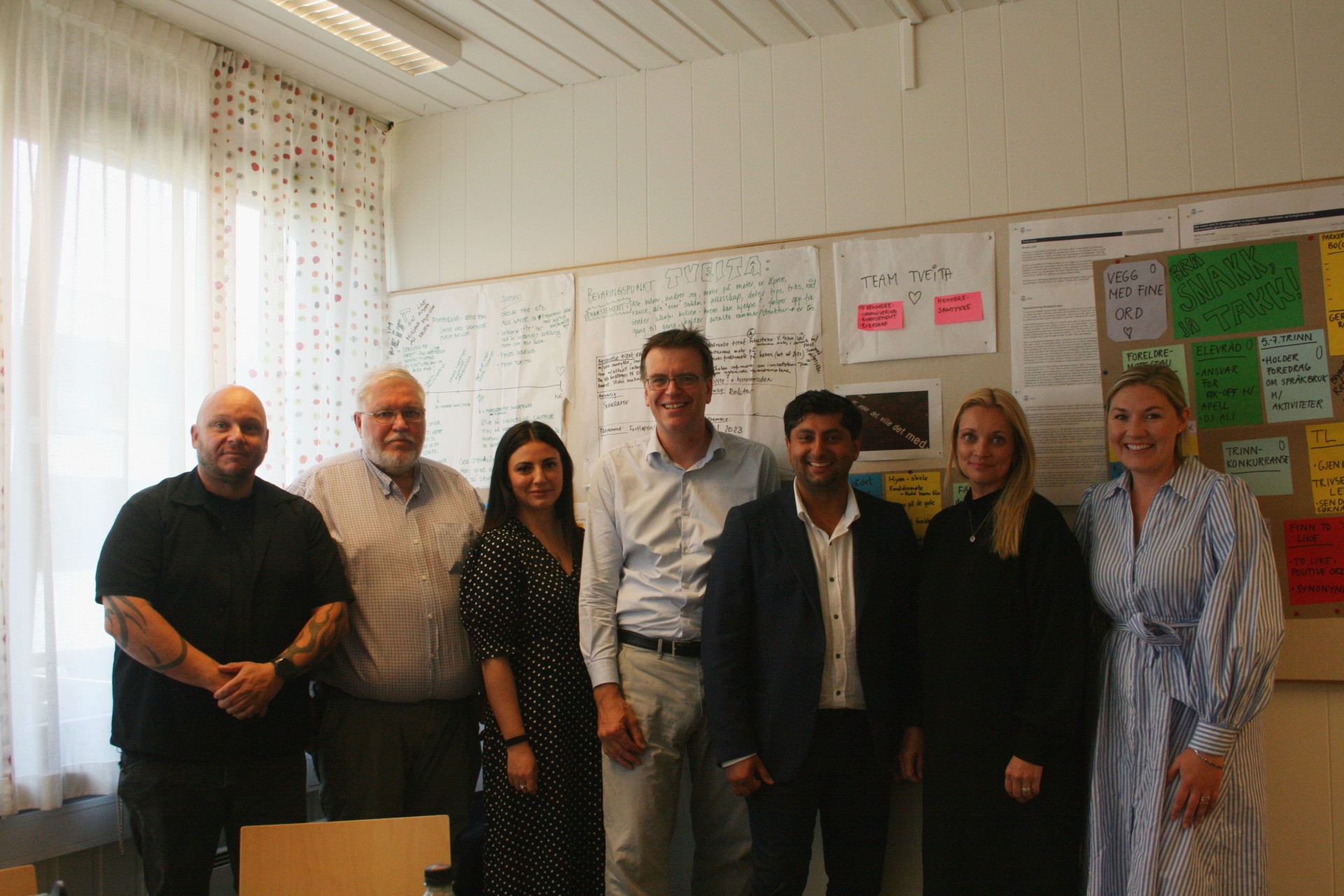 JA TIL SOSIALAGENTER: Roy Møllerud i barnevernstjenesten (f.v.), Vidar Solberg (Frp), Sosialagent Souhaila Bougrine, bystyrerepresentant Bjørn Revli (Frp), Stortingsrepresentant Himanshu Gulati (Frp), rektor Siw Anita Johnsen og Sunniva Sved Johansen mener at resultatene fra de fire skolene viser betydningen av fortsatt finansiering av Sosialagenter.Bilde 1 av 1