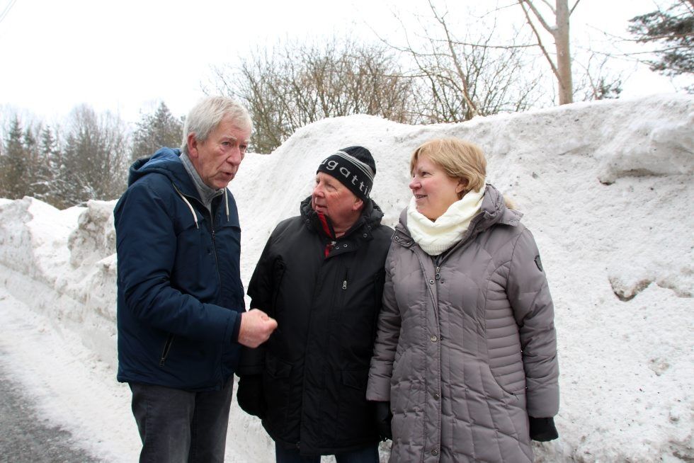 ROMSÅS-ENGASJEMENTET: Tor-Erik Røberg-Larsen (t.v.) er overbevist om at det er beboernes engasjement som førte til at snødumpingen tok slutt. Bjørn Barkald og Elna Svang slutter seg til det resonnementet. Her står trekløveret foran et godt innpakka autovern langs Odvar Solbergs vei. Foto:Bilde 1 av 4