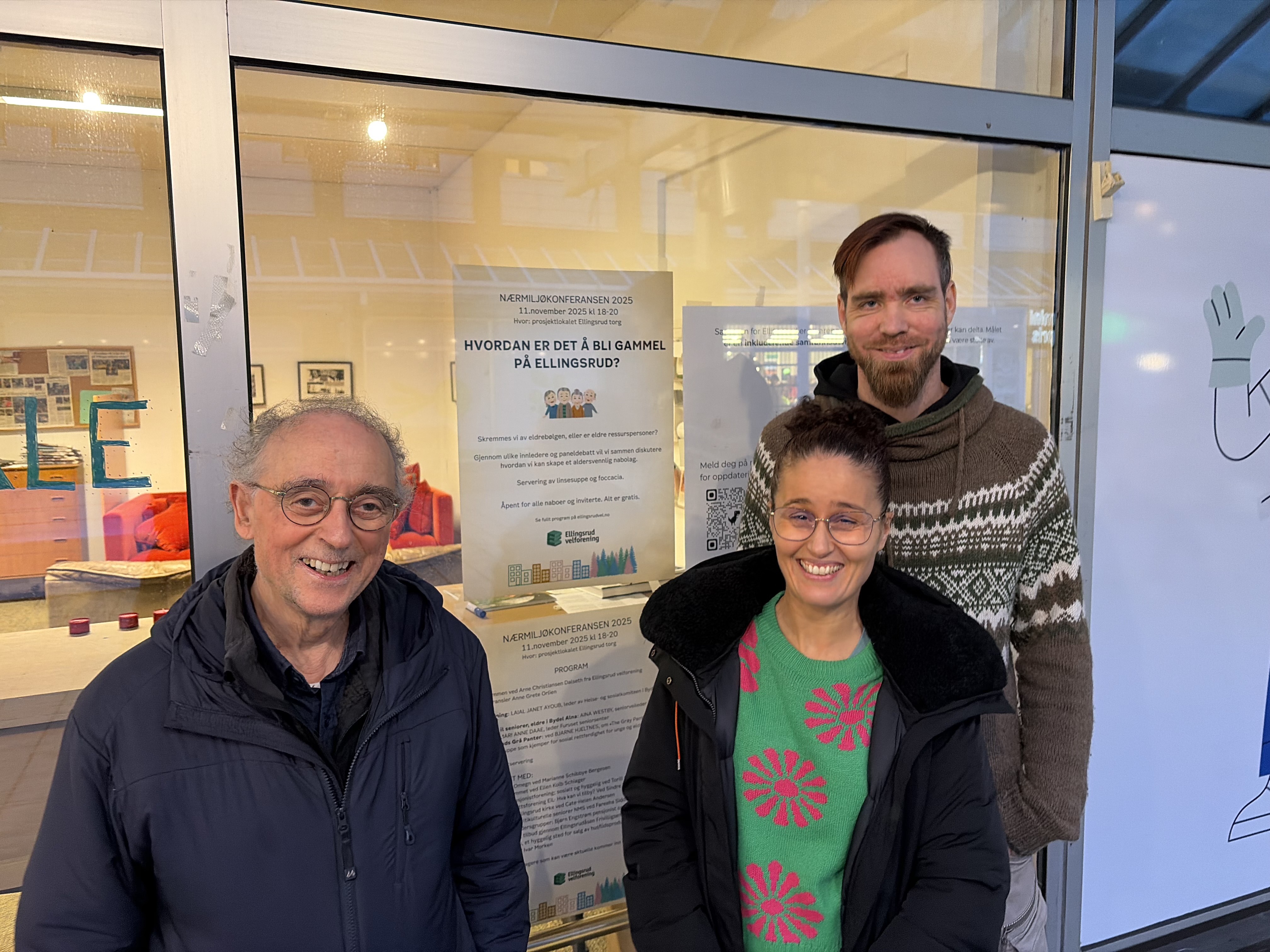 KLARE FOR KONFERANSE: Bjørn Engstrøm, Hanan El Idrissi og Arne Christiansen Dalseth i Ellingsrud Velforening inviterer til nærmiljøkonferanse tirsdag 11. november. FOTO: Nikolai HjetlandBilde 1 av 3