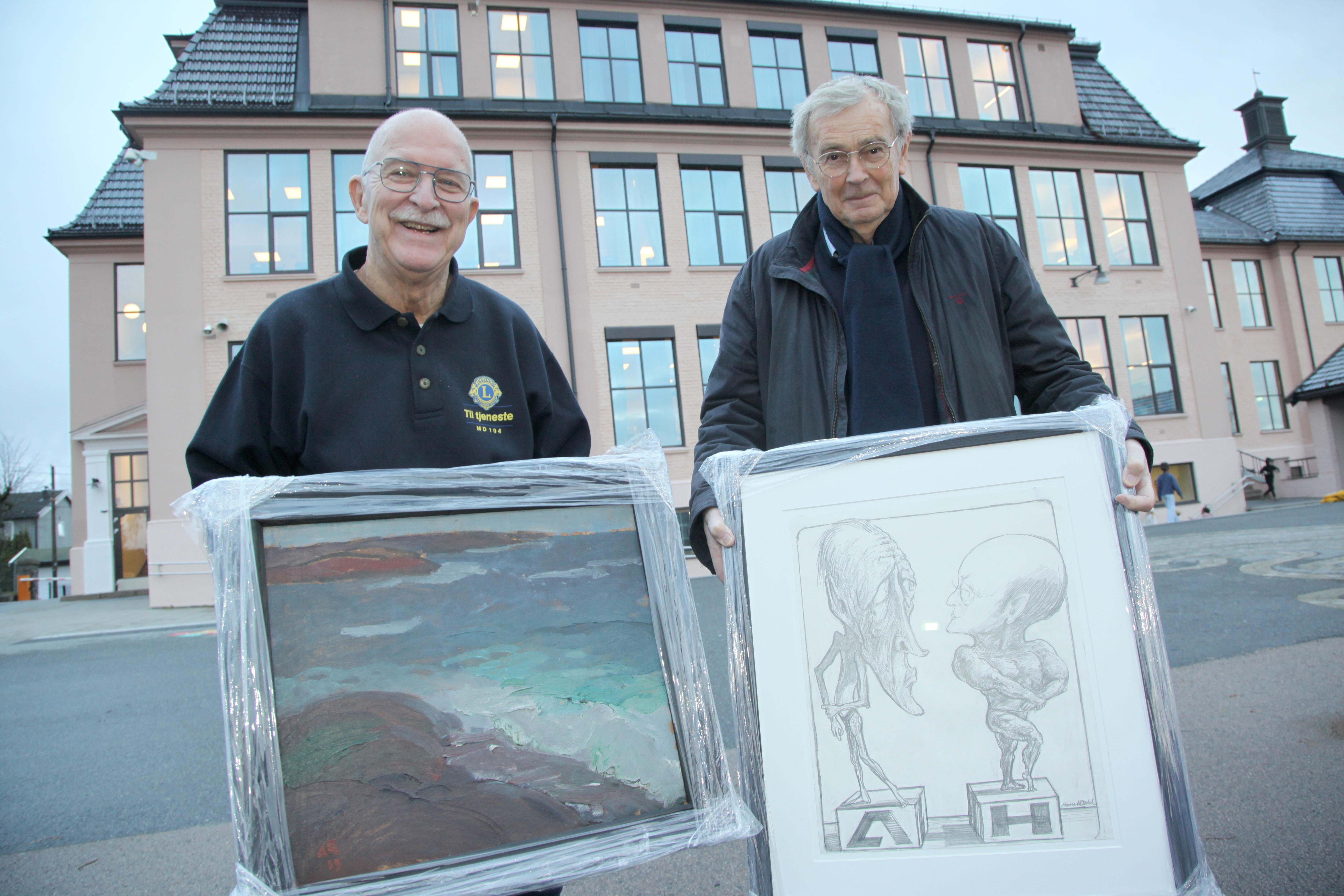 SPESIELL KUNST: Et oljemaleri av Arnulf Øverland og en politisk karikaturtegning av Hans Normann Dahl er blant de spesielle kunstverkene som leder i kunstkomiteen, Per-Kristian Petersen (t. v.) og Erik Nordahl kan friste med under helgens kunstutstilling i regi av Høybråten Lions. FOTO: Rolf E. WulffBilde 1 av 5
