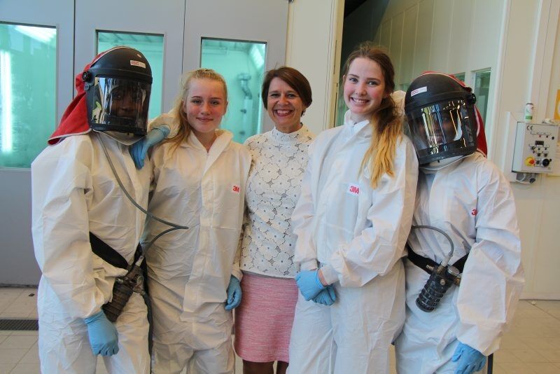 Skolebyråd Tone Tellevik Dahl (Ap) fikk møte mange ivrige sommerskole-elever som bruker ferien til en smakebit av yrkesfag. Petra, Kaja, Karina og Thushana fikk prøve seg på billakkering.