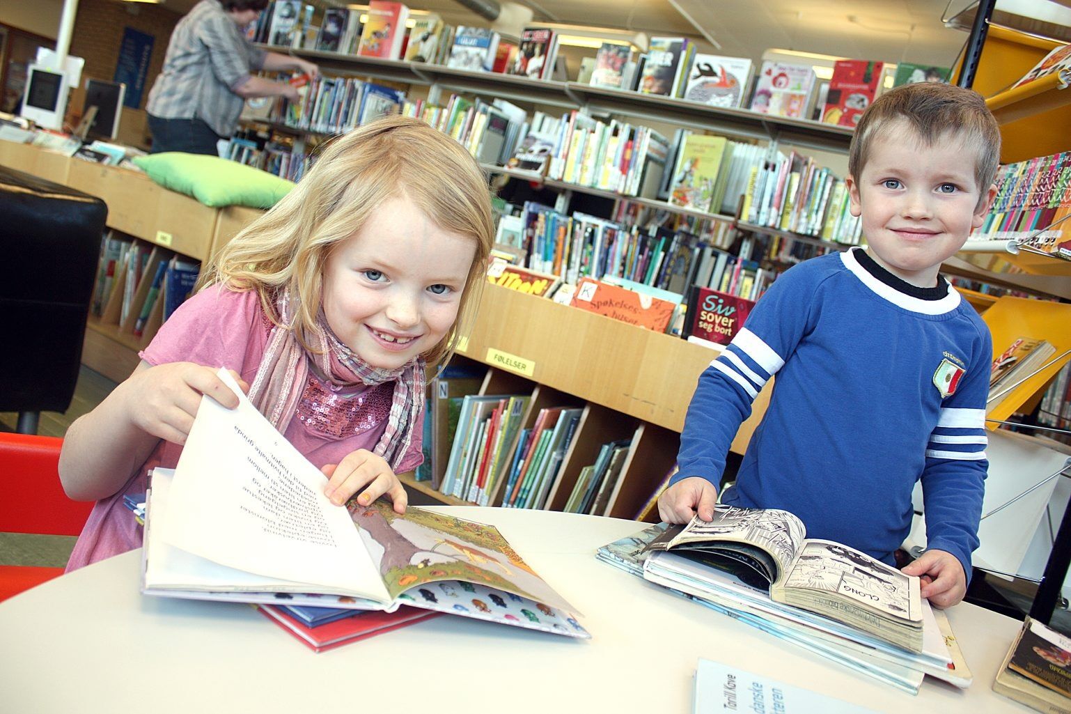 Søsknene Vilde (7) og Torkel (4) skulle egentlig låne bøker på Nordtvet bibliotek. Men så ble det fortellerstund også.