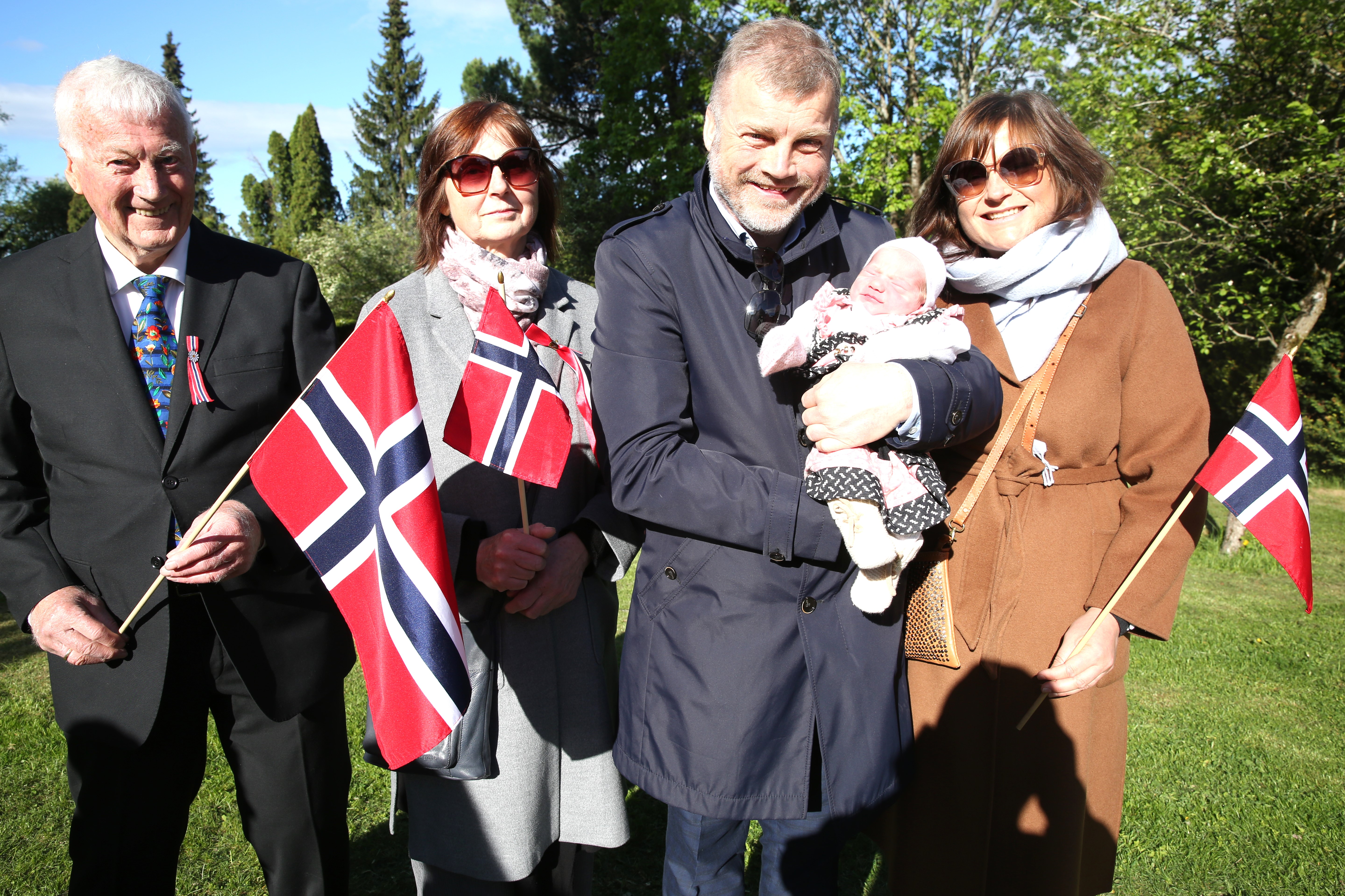 INTERNASJONAL FAMILIE: Bestefar Arne Thoresen, bestemor Karin Haring, pappa Bård Thoresen og mamma Hanna Haring viser stolt fram lille Vela, som en uke gammel møtte opp for å feire 17. mai på Grorud skole. FOTO: Rolf E. WulffBilde 1 av 5