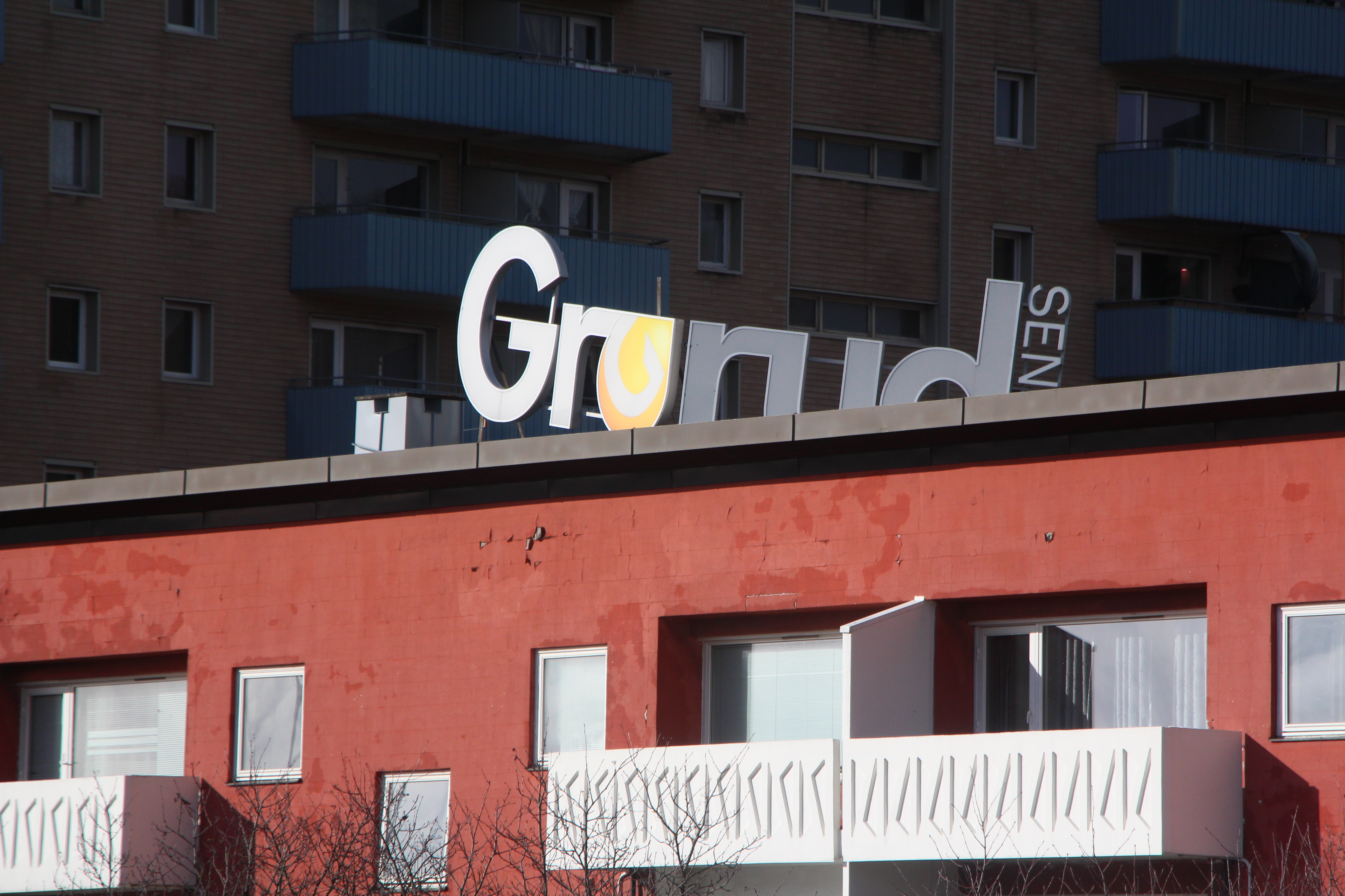 Senterskiltet på taket til sameiet ut mot Trondheimsveien ser ut til å ha løsnet fra festet sitt.