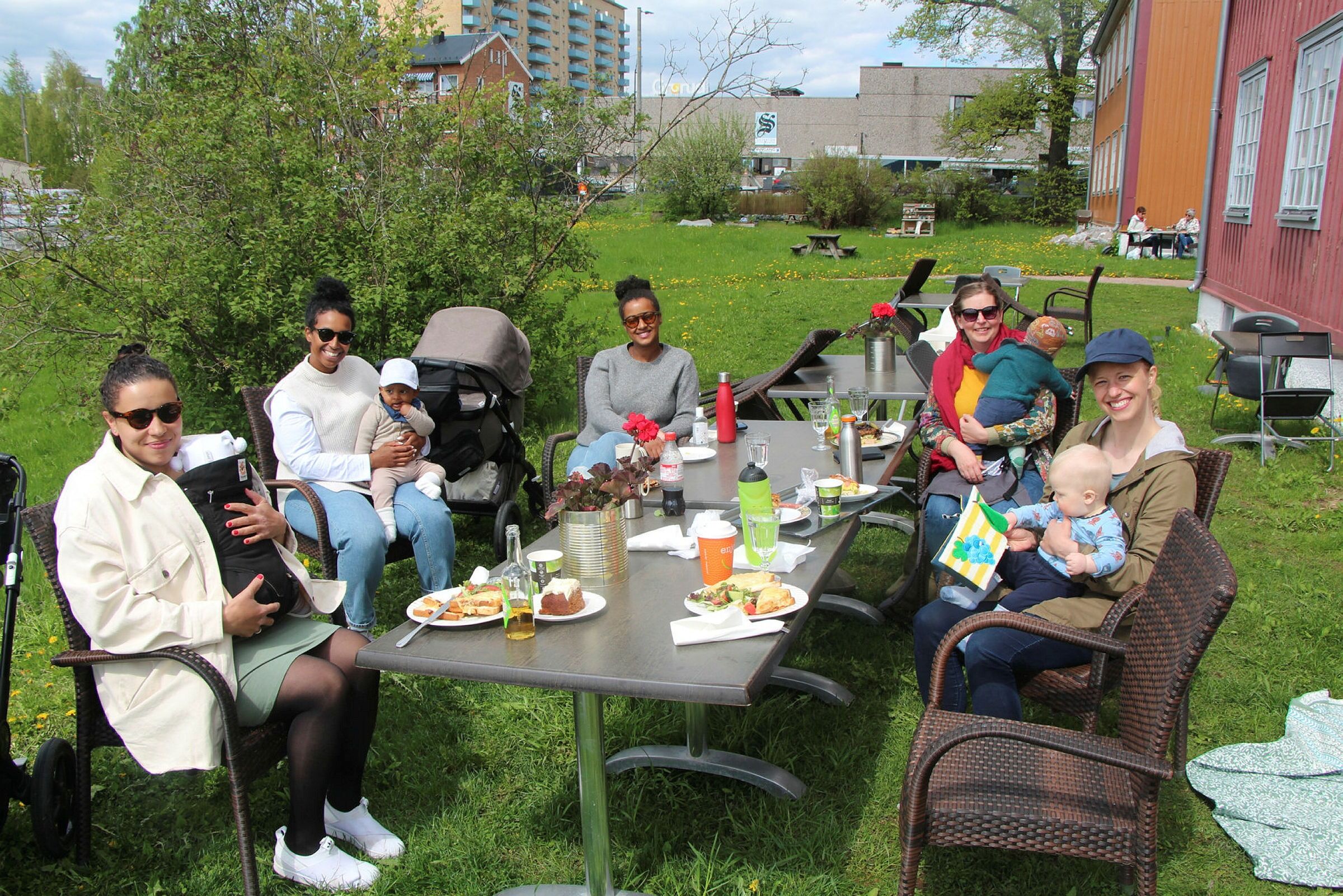 I solveggen i hagen til Kafé Steinbra fant barselgruppa seg godt til rette i hyggelig selskap og med en liten matbit.