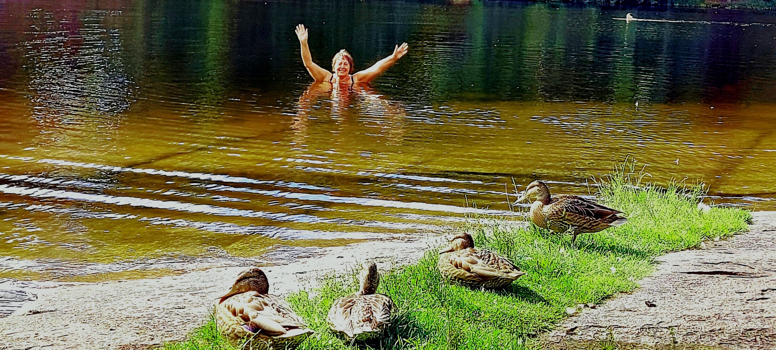 BADENYMFA PÅ GRORUD: Om Reidun Melland prøver å skremme endene eller få de til å bli med, er ikke godt å si. Men det er i hvert fall ingen tvil om at denne dama er glad i å bade. At noen har tatt over dammen, er derimot disse endene ikke like begeistret over. Det hele er fotografert av Eva Mauseth. Foto:Bilde 1 av 5