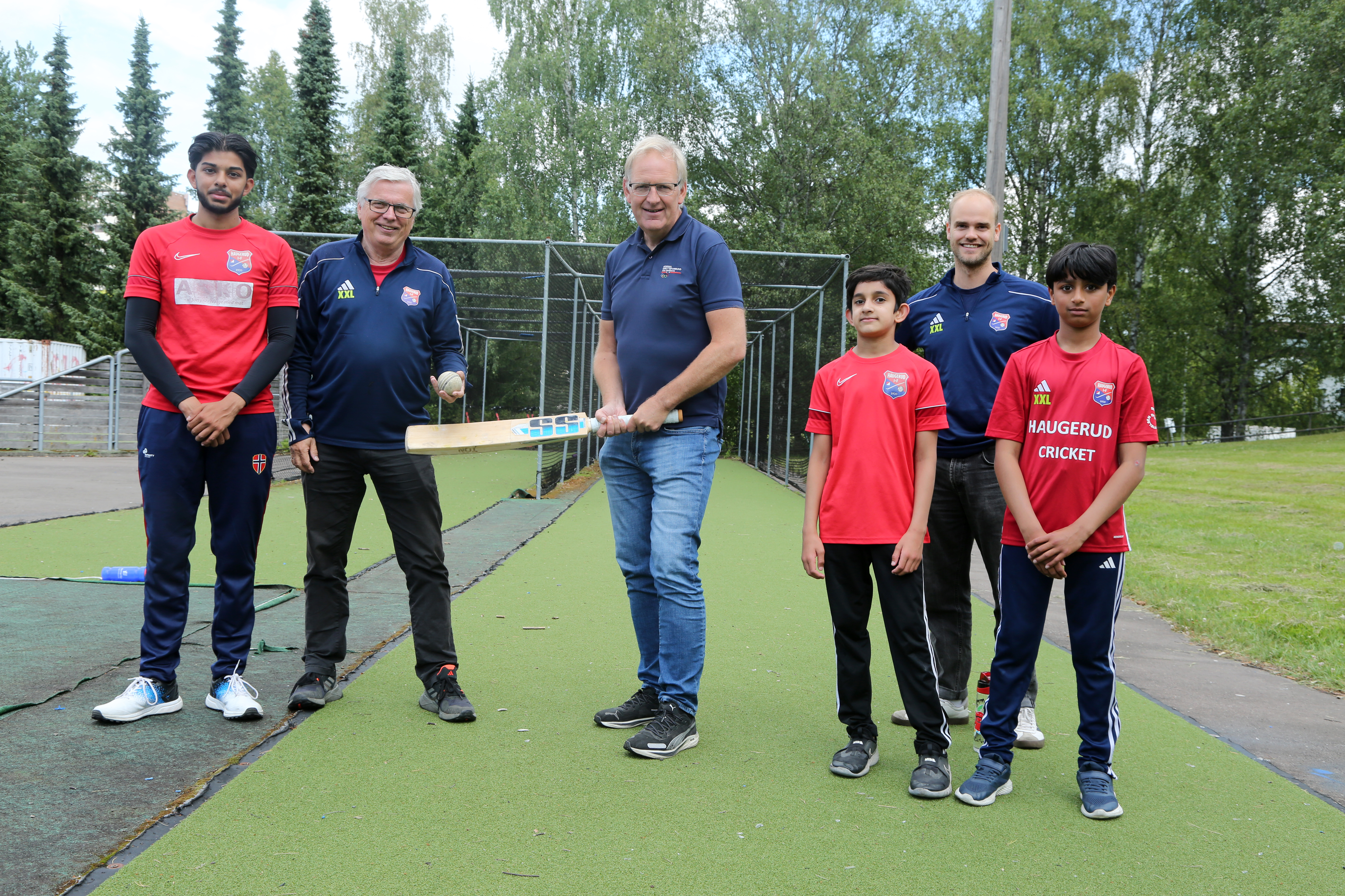 HELE BYGDA: Haugerud IF er en klubb for hele Haugerud/Trosterud-området, også mellom blokkene – og ikke minst en klubb som favner det store og brede flerkulturelle miljøet i området. Det har gitt rom for å starte opp nye idretter slik som cricket. Fasihullah (16, f. v.), styreleder Dag Endal, generalsekretær i Oslo Idrettskrets, Magne Brekke, Hadi (11) daglig leder Jone Hjorteland og Zakarya (11). FOTO: Rolf E. Wulff