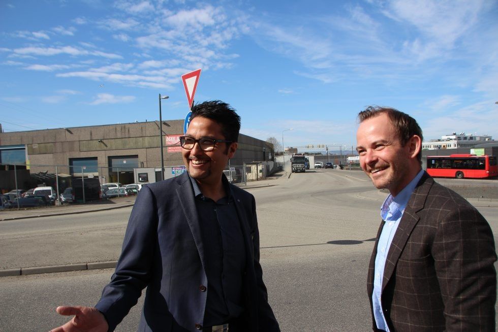 KRAFTSENTER FOR INNOVASJON: Construction City skal ligge til venstre i bildet, tvers over rundkjøringen. Innovasjon og nytenkning er blant nøkkelordene, og Daniel Siraj og Andreas Røsjø lot seg rive med. Her står de og planlegger hvordan den lokale pølsekiosken kan inkorporeres i prosjektet. Foto:Bilde 1 av 4