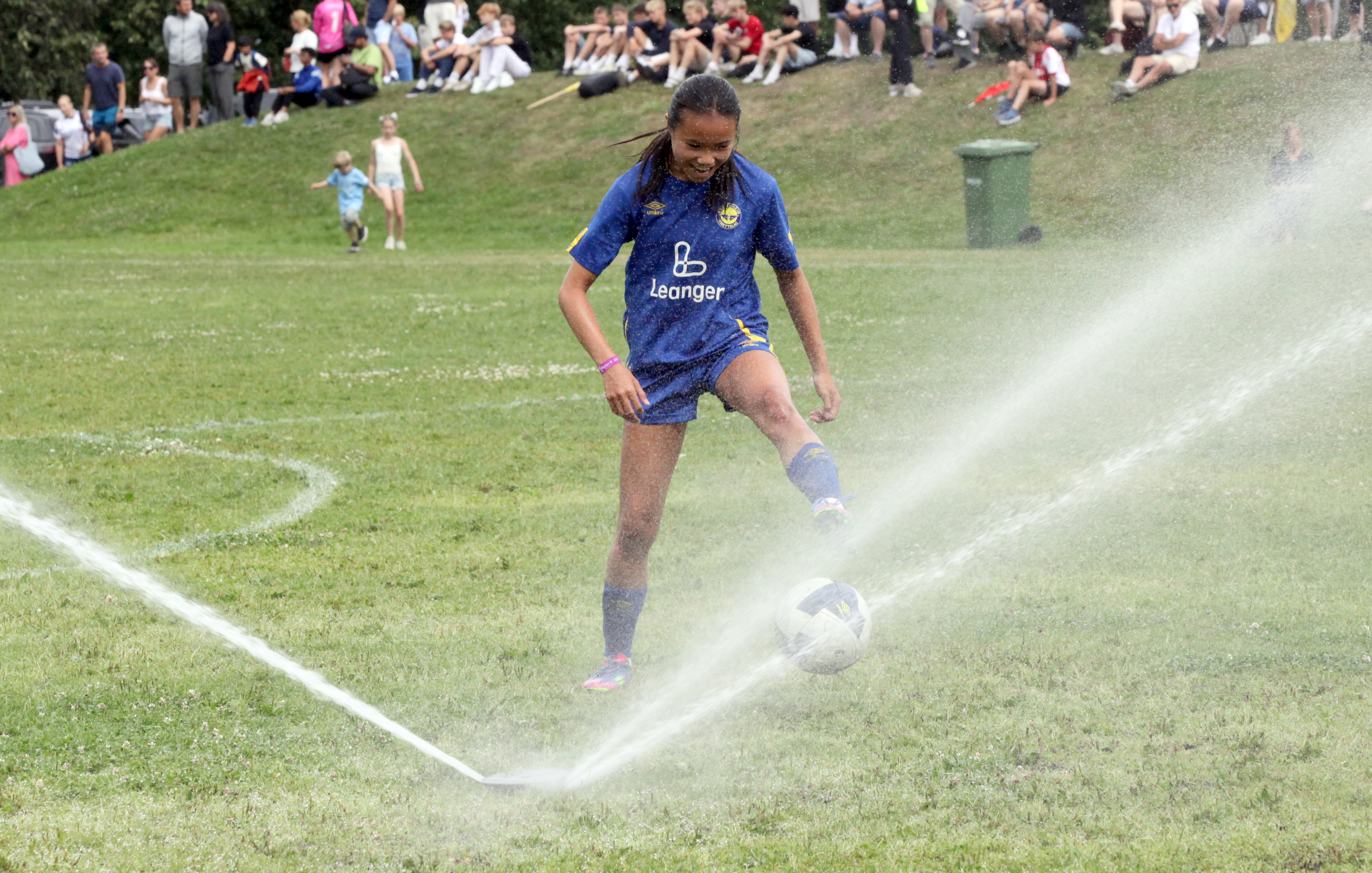 VÅT OPPVARMING: Leona Tran (15) og de andre jentene på Strindheim fikk en fuktig oppvarming før kampen mot tyske VFL Pinneberg. Kampen måtte utsettes nesten en time før vanningen ga seg. Det hadde vært uforsvarlig å sende jentene ut på gressmatta i full kamp med vannet på. FOTO: Rolf E. WulffBilde 1 av 7