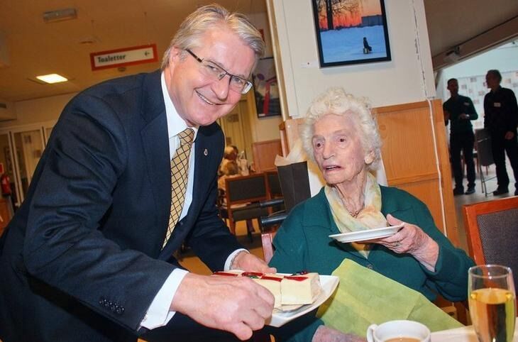 Alle som fyller 100 får gratulasjonskort av Kongen og ordfører tilsendt i posten, men ikke alle får gleden av høytidelig besøk. Berna Skarre fikk derimot servert kake av ordføreren selv.