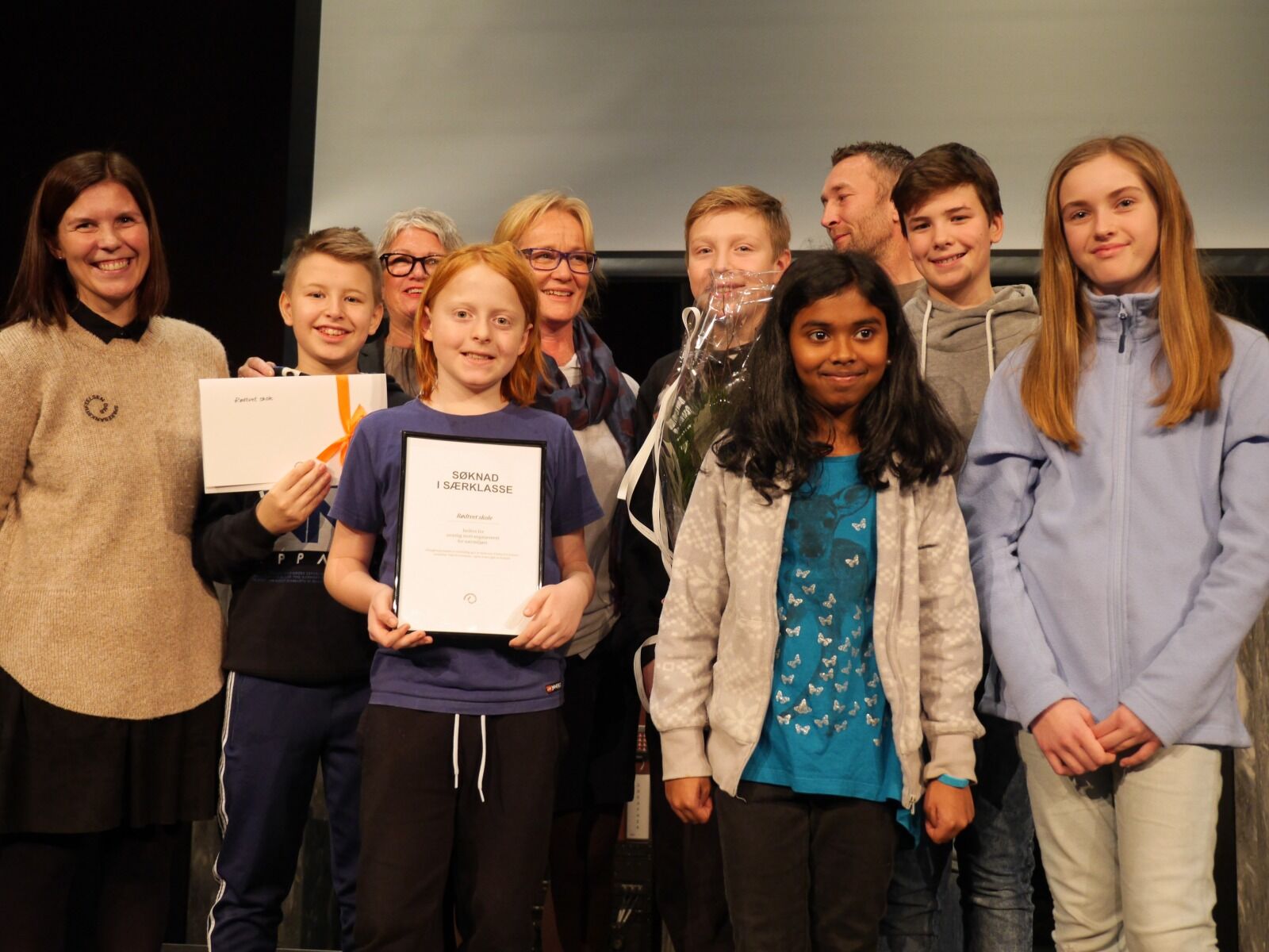 PÅ SEREMONIEN: Sammen med rektor og foreldregruppa fikk noen av elevene være på utdelingen til Sparebankstiftelsen. Foto:Bilde 1 av 3