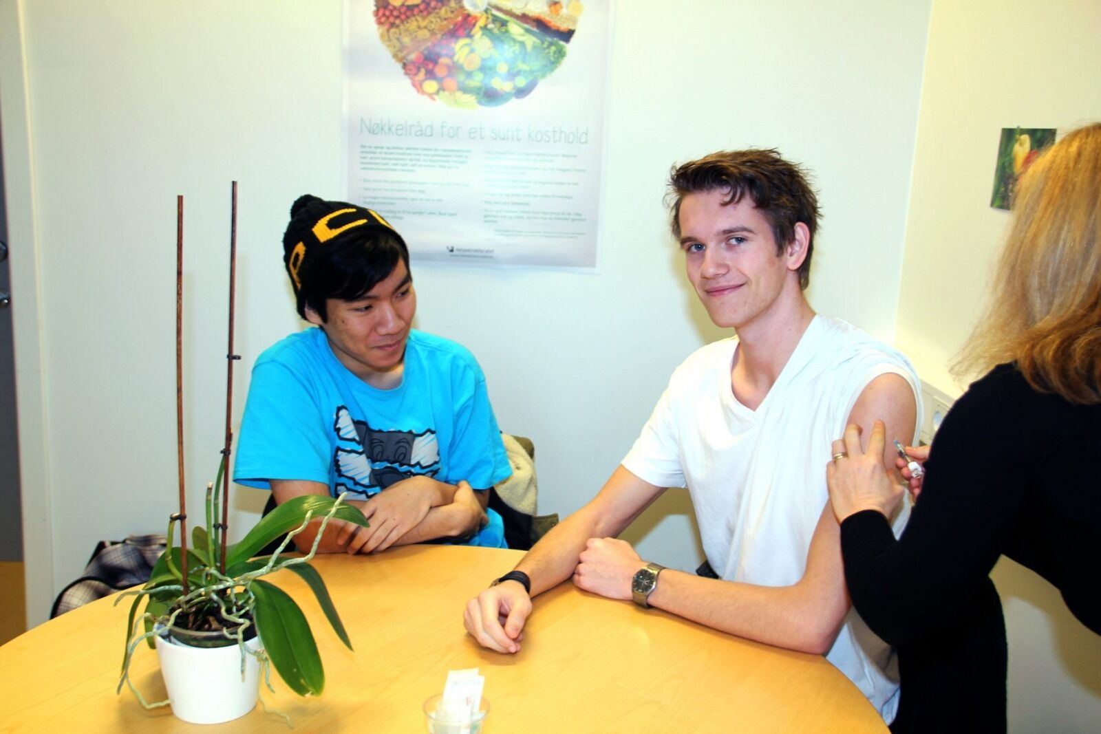 I år har helsesøstrene på Stovner videregående mindre å gjøre på vaksinedagen for hjernehinnebetennelse. Men Son og Sindre liker å være forberedt, og var først ute med å ta vaksinen.