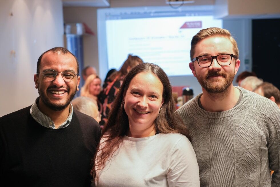 PÅ ÅRSMØTE: Byråd Omar Gamal (t.v.), Siv Marit Lethigangas, medlem av Bjerke bydelsutvalg, og leder i Bjerke SV, Ola Wolff Elvevold, samlet resten av SV-gjengen i Bydel Bjerke på Veivet senter. (Foto: Bjerke SV.) Foto:Bilde 1 av 1