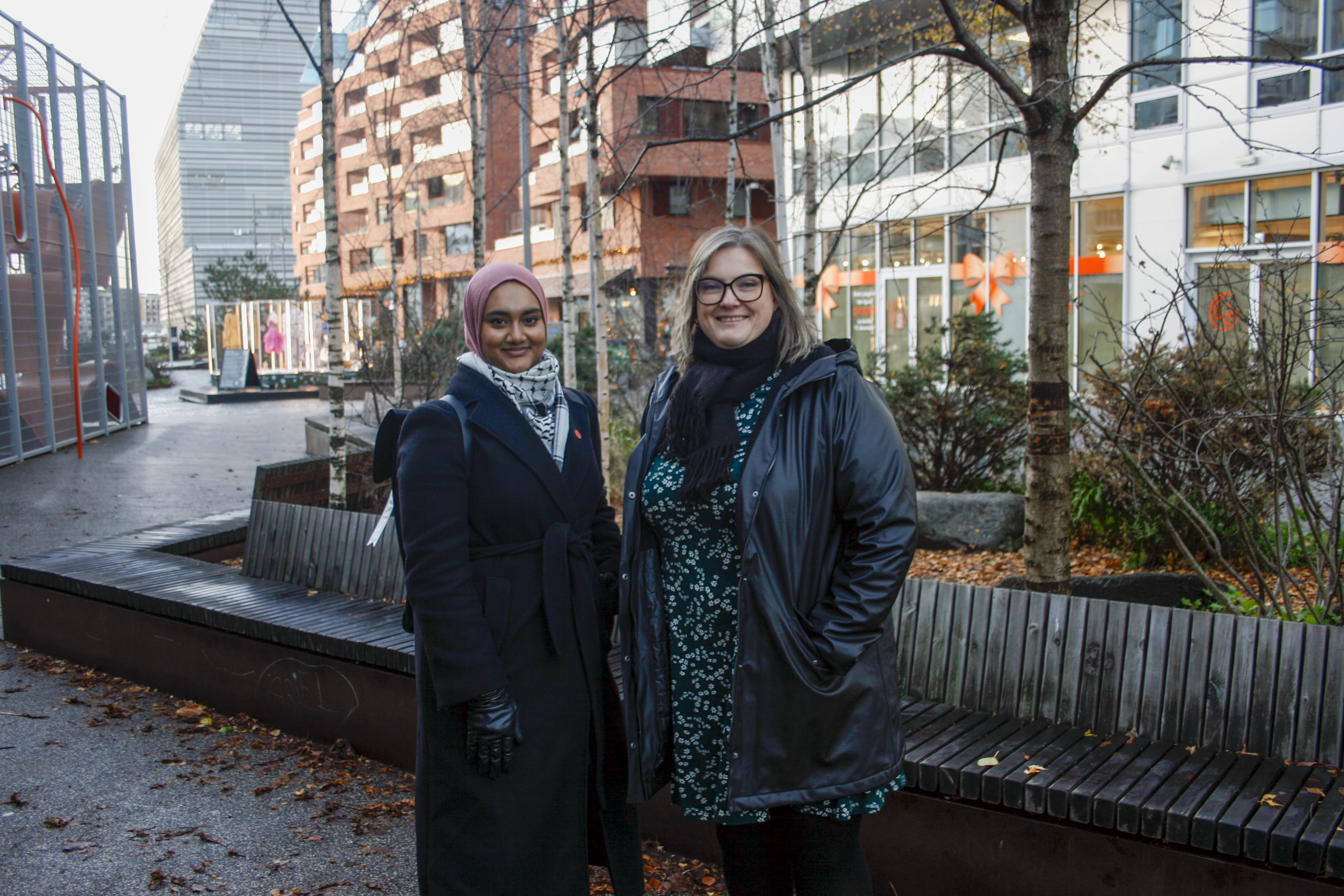 LIV MELLOM BLOKKENE: Beplanting og litt møbler kan bety mye for at et område oppleves som tryggere. Tamina Sheriffdeen Rauf (Ap, t.v.) og Malin Bye Sørensen (Ap) peker på løsningen i Bjørvika som et eksempel på hvordan det kan gjøres.
