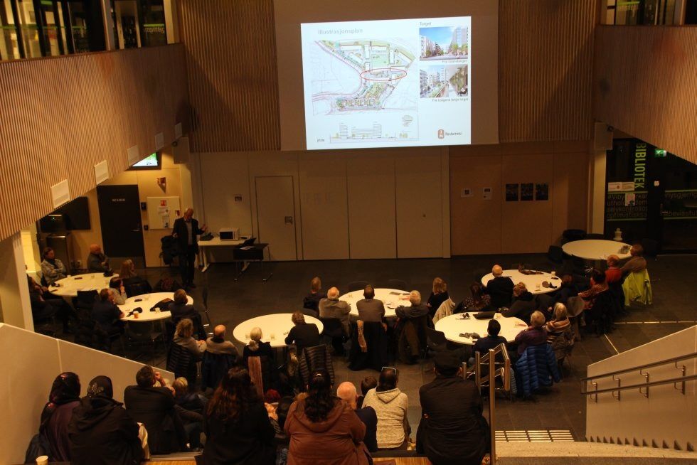 FREMTIDA: Det var mange som ville få med seg en oppdatering på Furuset-prosjektene denne torsdagskvelden. Her er det Svein Prytz fra JM som forteller om boligene på Karihaugen. Foto:Bilde 1 av 7