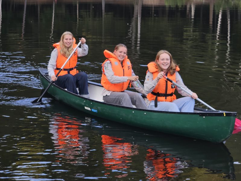 FRILUFTSGLEDE: Idun Soltvedt Klæbo (f.v.), Eline Westermoen Dugstag og Alma Rygh Holten i en kano, som er blant aktivitetene under Friluftslivets dag ved Isdammen på Årvoll.