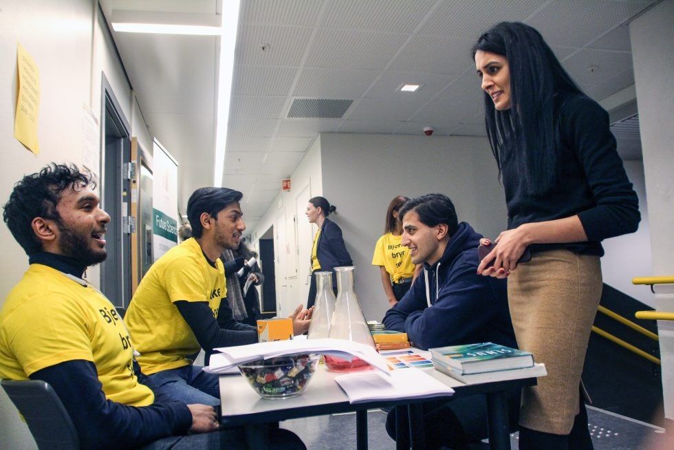 VIL BEVARE VALGFRIHETEN: Høyres Saida Begum (t.h.) og Hassan Nawaz frykter loddtrekning og tilfeldigheter for skoleelevene hvis ordningen med fritt skolevalg skrotes. Her i frisk diskusjon med Bjerke-elevene Vakksan Subaskaran og Richard Limalanathan. Foto:Bilde 1 av 2