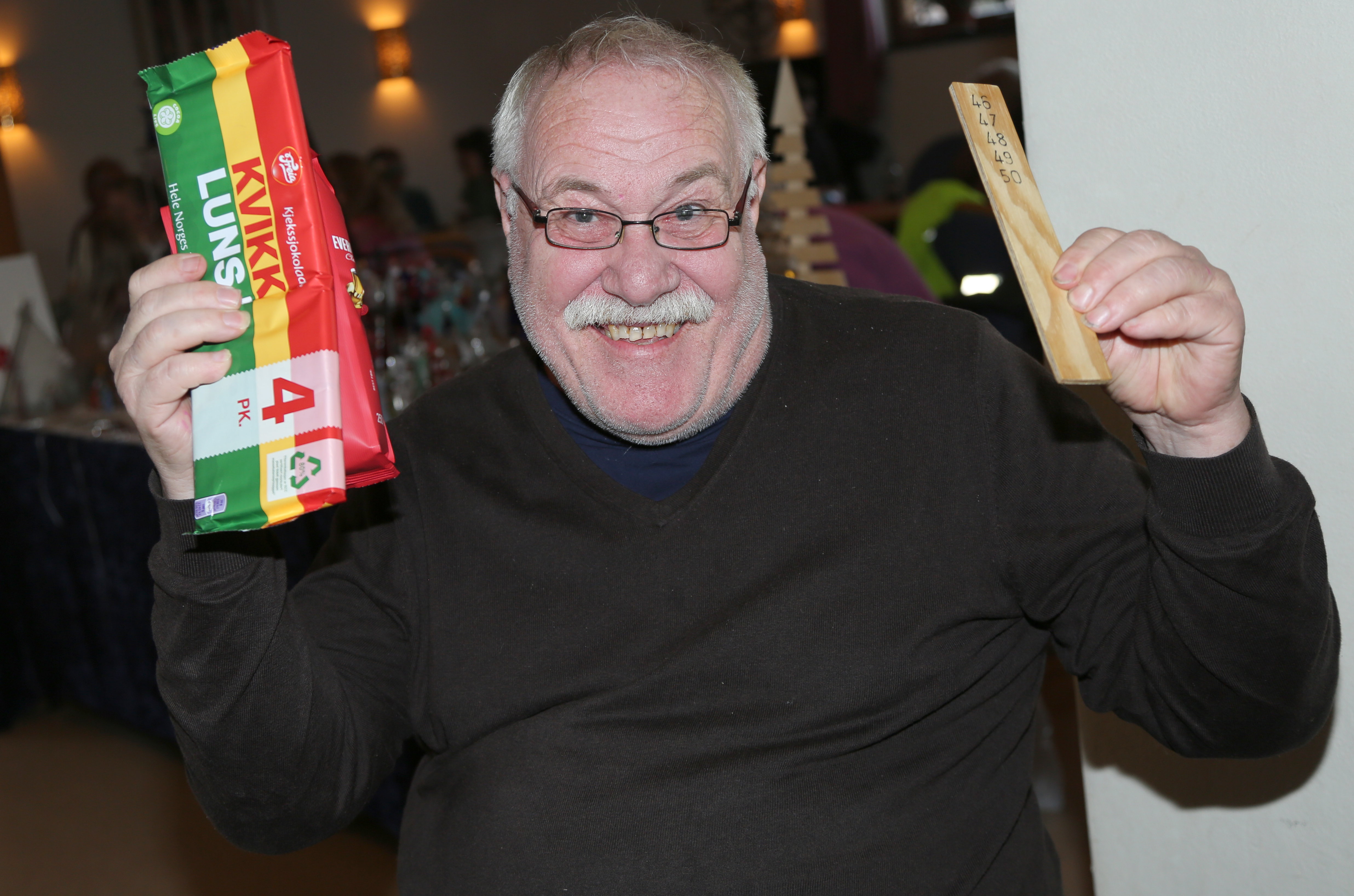 SJOKOLADEGLAD LEDER: Leder for Tonsenmessa, Roy Oliver Jahnsen, tok seg en liten pust i bakken under messa og kjøpte årer - det resulterte i både kaffe og sjokoladegevinst. FOTO: Rolf E. WulffBilde 1 av 5