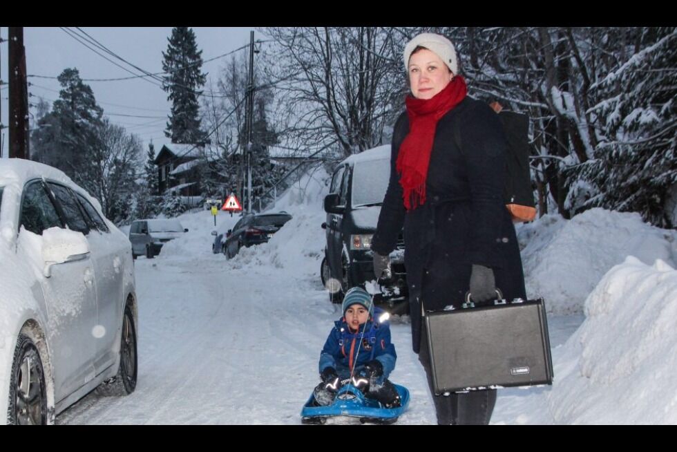 UKOMFORTABELT: Gunhild R. Farstad og sønnen David må noen ganger ut i selve brøytekanten for å lage plass til bilene. David er ikke store karen sittende på akebrettet sitt, og Farstad er en av flere foreldre som frykter at det kan oppstå uhell i Lilloseterveien. Foto:Bilde 1 av 2