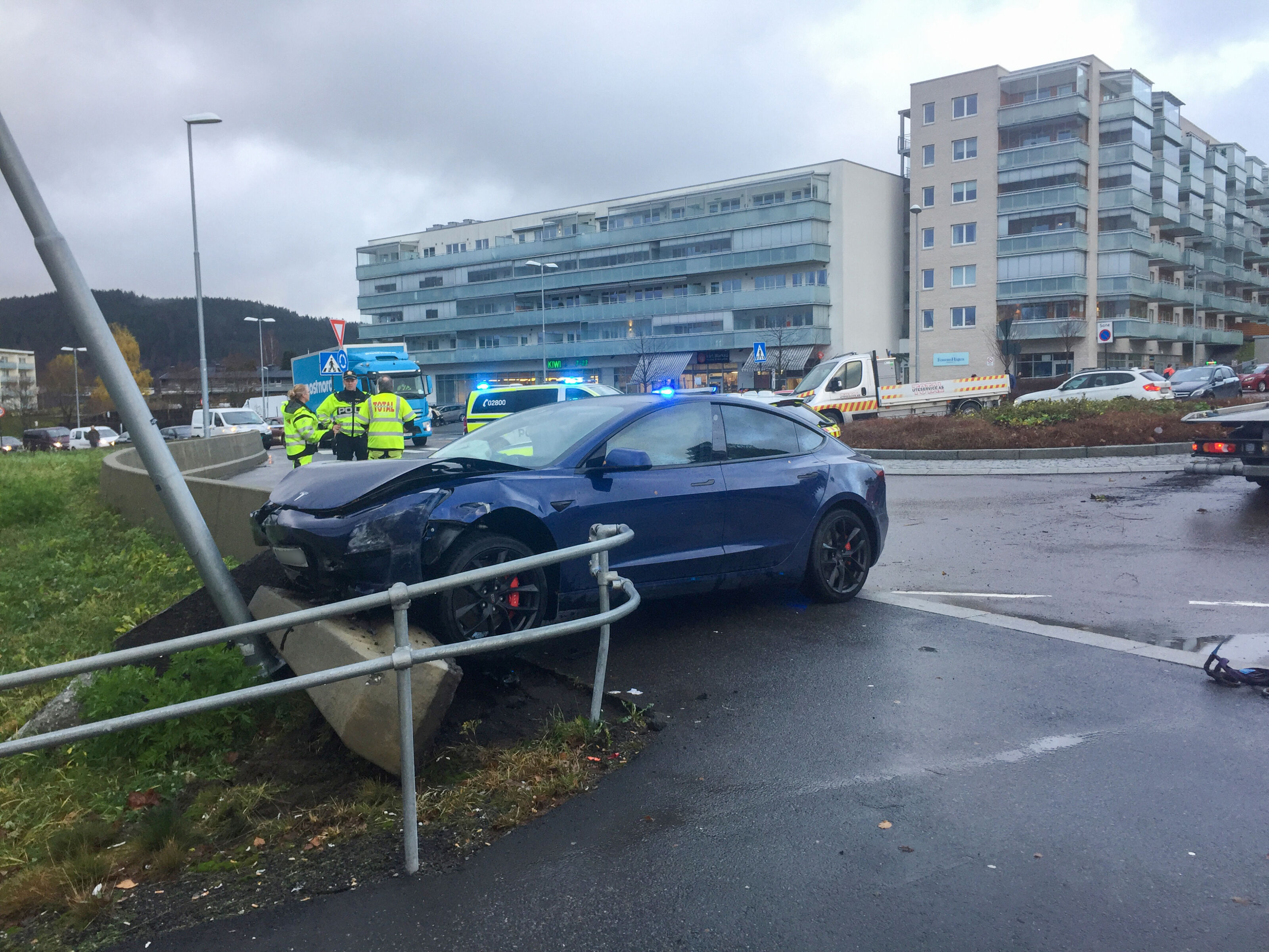 Ut fra videoovervåking ser vi at til alt hell kom en kvinnelig fotgjenger seg akkurat unna fra å bli truffet av bilen. Denne kvinnen var iført en grønn jakke og forlot stedet før politiet kom. Vi ønsker å komme i kontakt med henne. Denne ulykken har ført til mye kø i området.