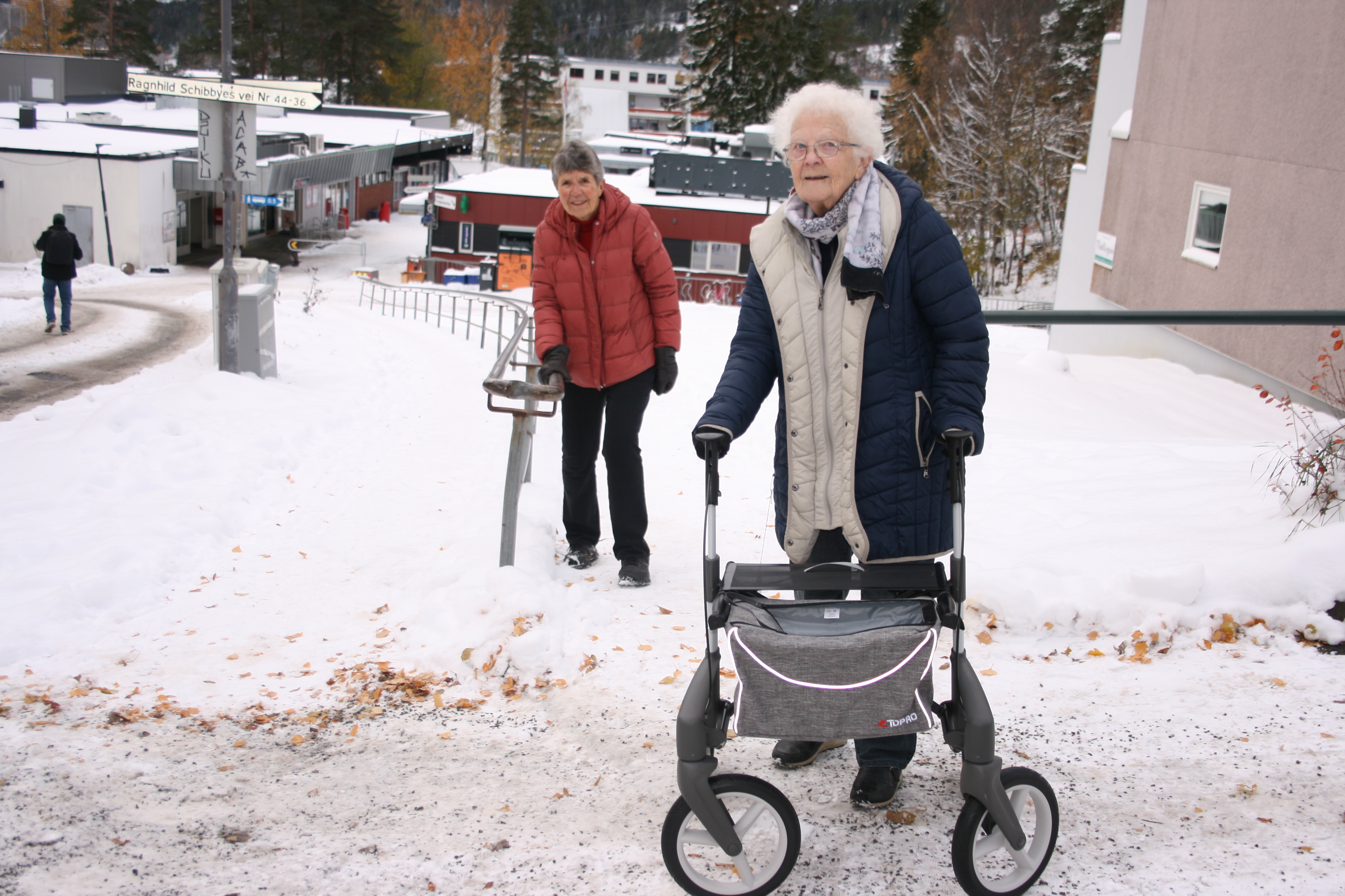 BRATT OG GLATT: Sigrid Wisløff (bak) og Bjørg Pedersen må holde seg godt fast om de skal opp eller ned gangveien på Vestli, selv før det har iset til på stedet.Bilde 1 av 3