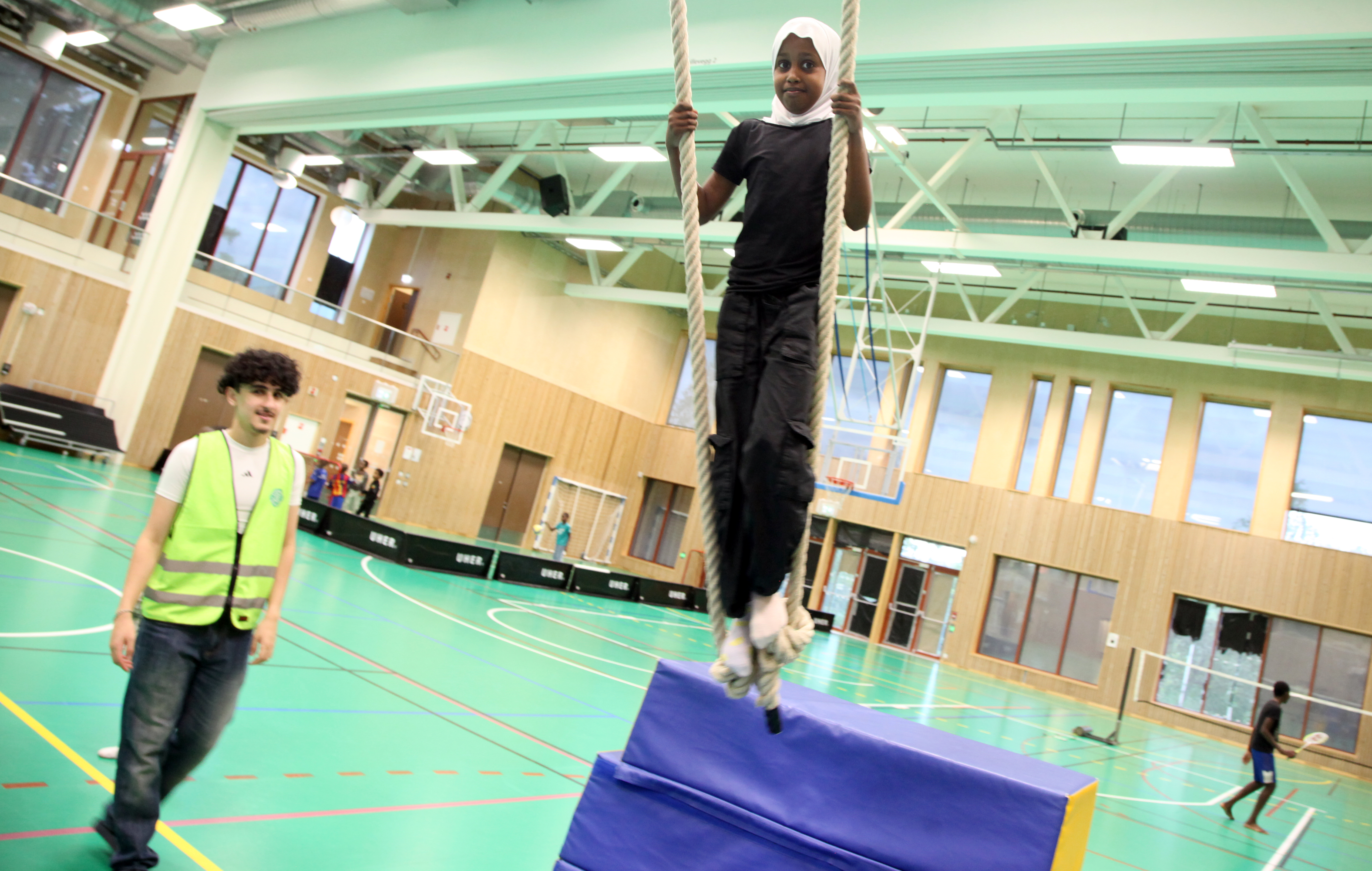 Mariama (10) har knyttet sammen to klatretau, og dermed har hun verdens fineste selvlagde huske. Så svinger hun seg fram og tilbake i Vestli flerbrukshall – og det har hun gjort i nesten en hel uke. Men i utgangspunktet var det basketballcamp Stovner SK inviterte til.