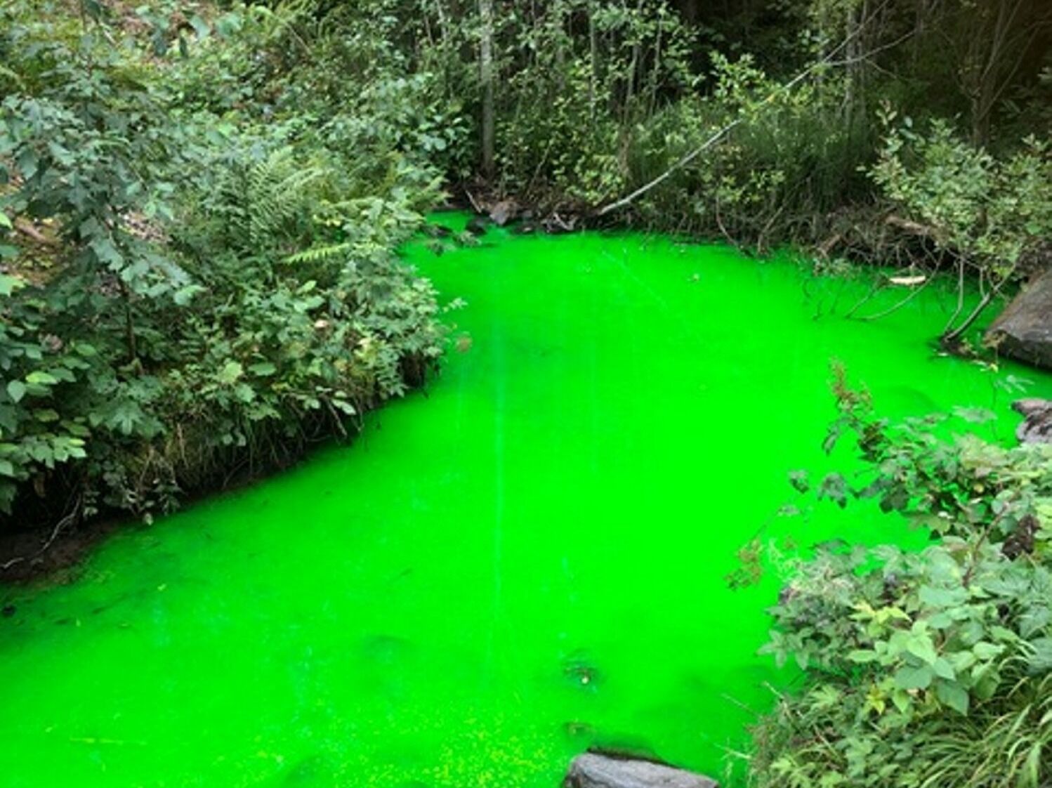 Grønnfargen viser at det lekker fra et avløpsrør. Vann- og avløpsetaten heller pulver i avløpsrørene, og dersom vannet blir grønt har de funnet lekkasje. Det er ikke farlig.