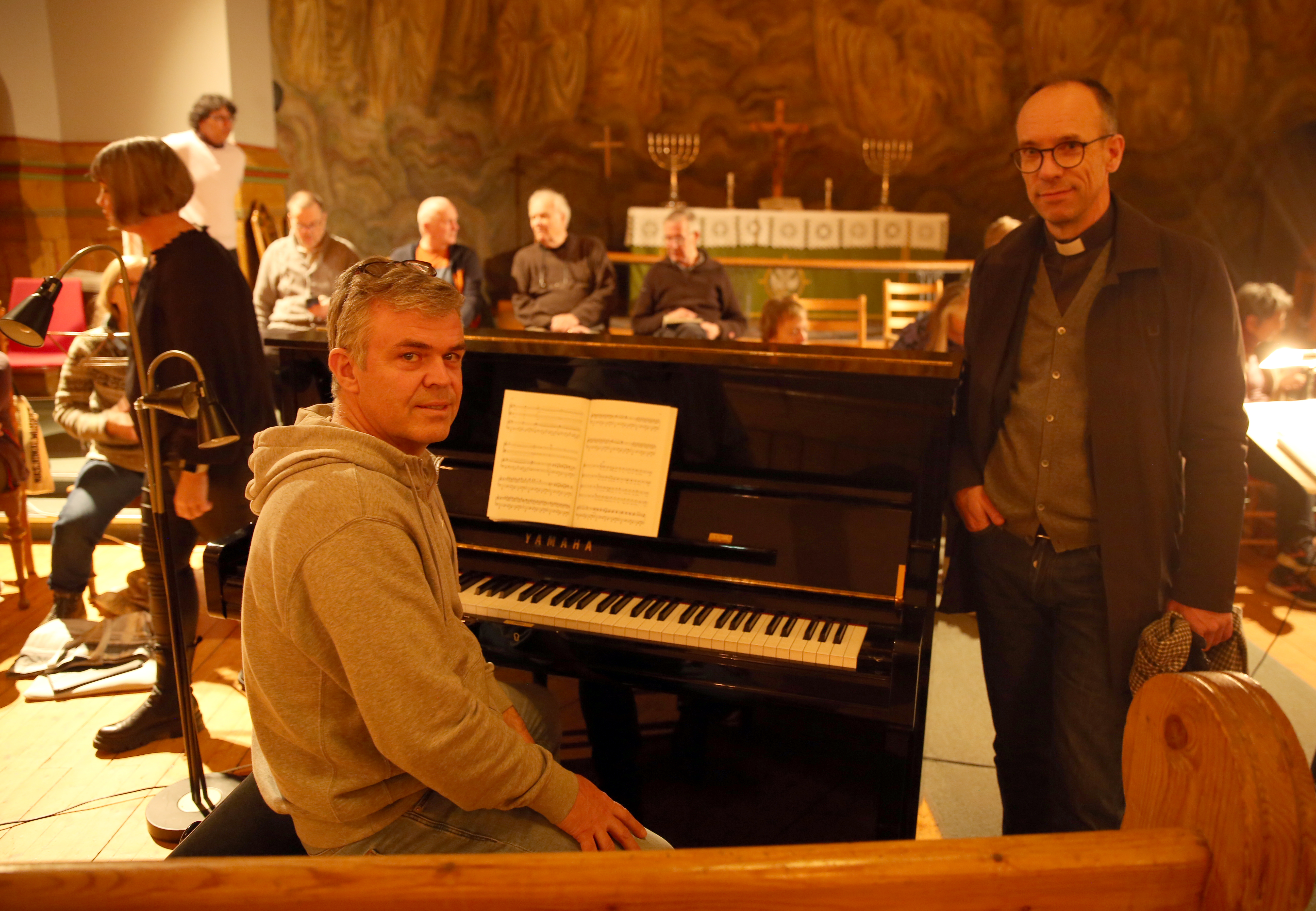 VIKTIG MESSE: Kantor og dirigent Roar Berg (t v) i Grorud menighet og prost Christofer Solbakken i Groruddalen prosti, påpeker at det akkurat nå er enda mer viktig å fremføre en freds og antikrigsmesse. FOTO: Rolf E. WulffBilde 1 av 5