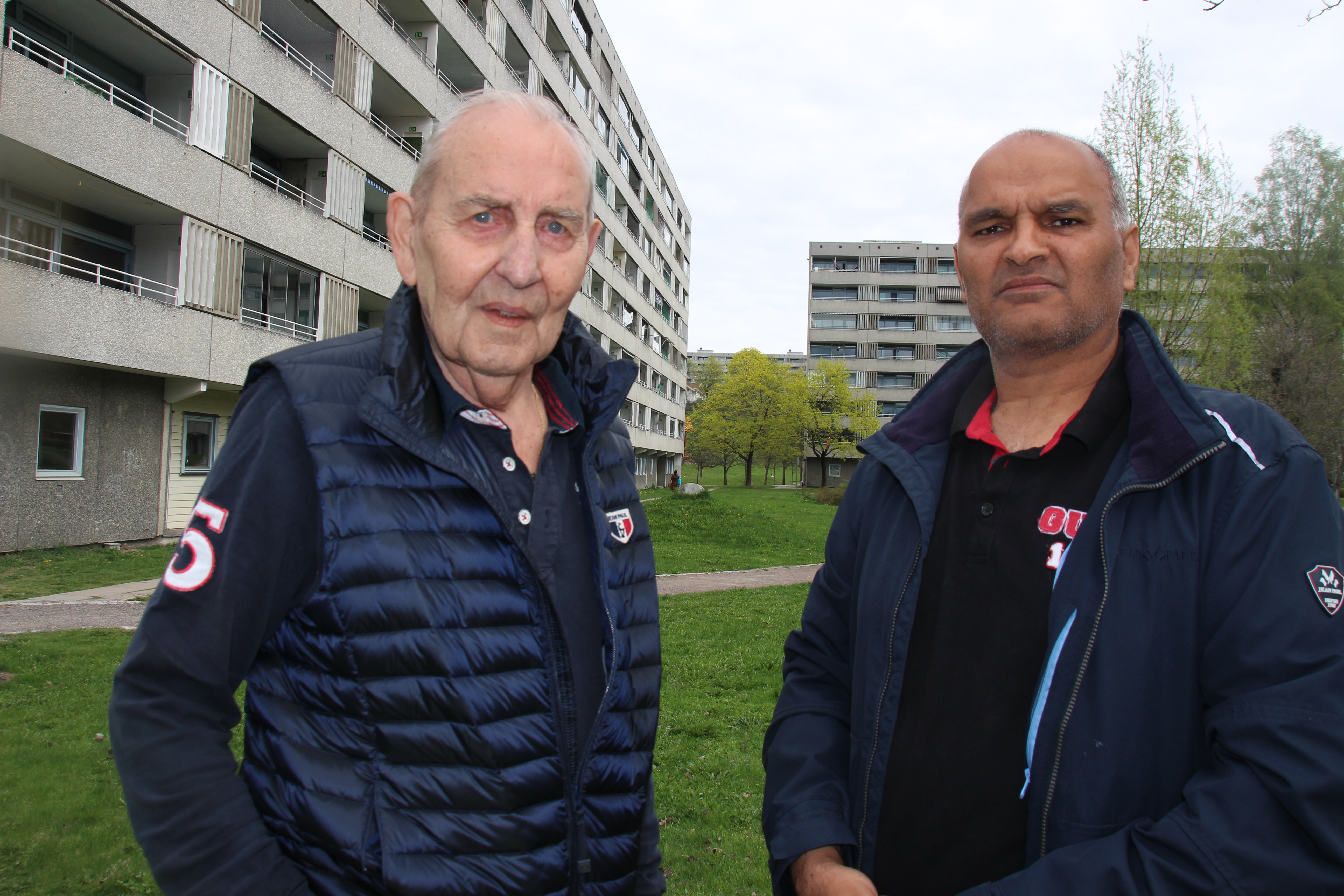 STÅR MED BEBOERNE: For Bjørn Halme (t.v.) og Rashid Nawaz handler det nå om å få løftet saken til et høyere politisk nivå. De mener sunn fornuft må komme fram. FOTO: Martine Myhre Shurdhiqi