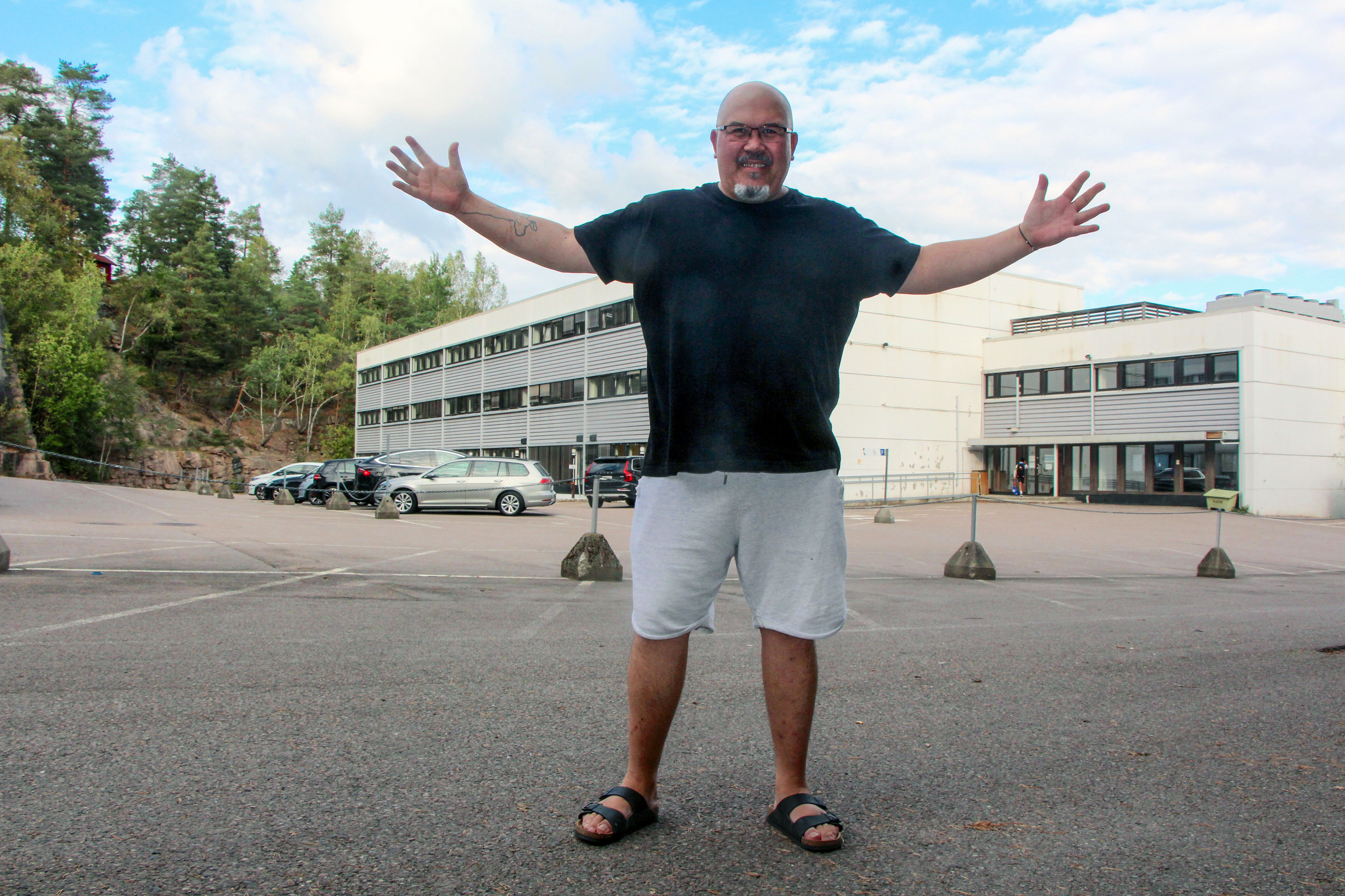 David Garcia utenfor Osloblokka Ammerud, bygget han har forvandlet fra tomme kontorer til et levende gründerhus. FOTO: Sindre Veum ApnesethBilde 1 av 7