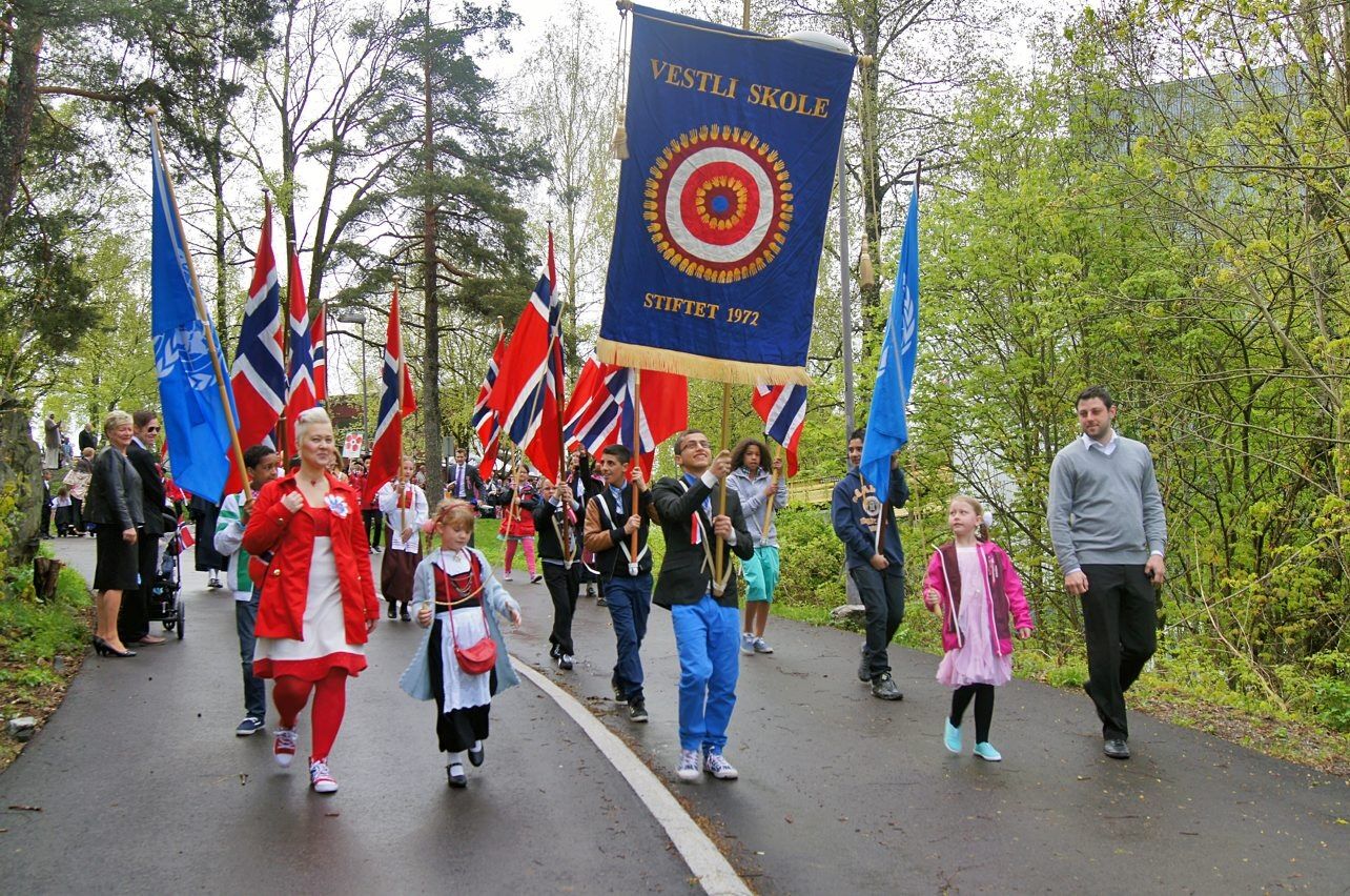 Etter at de mørke skyene hadde trukket seg unna og gitt plass til solskinnet, ble det god 17. mai-stemning i hele Groruddalen. Pa Vestli jublet barna i borgertoget for solskinn og is.