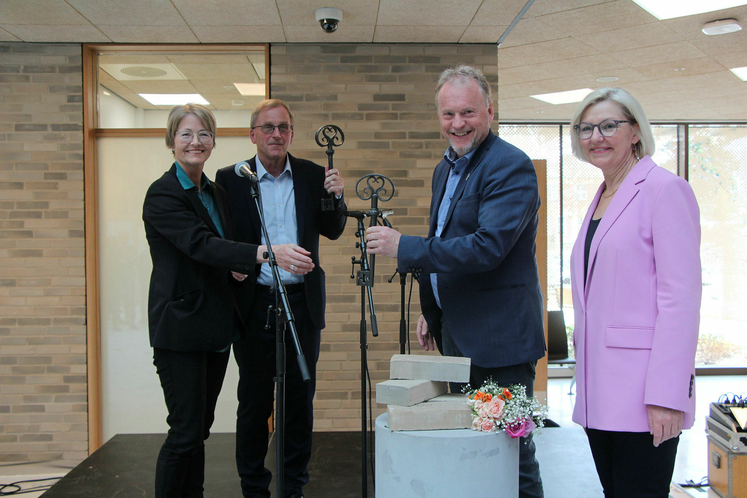 NØKKEL-DAG: Fremdeles er det litt som gjenstår før den nye legevakta åpner i november. Men tirsdag kom prosjektet i mål med nok et nøkkelpunkt, nemlig nøkkeloverrekkelse. Her med Hilde Terese Hamre (f.v), Morten Reymert, Raymond Johansen og Eli Grimsby. Foto: Sindre Veum ApnesethBilde 1 av 1