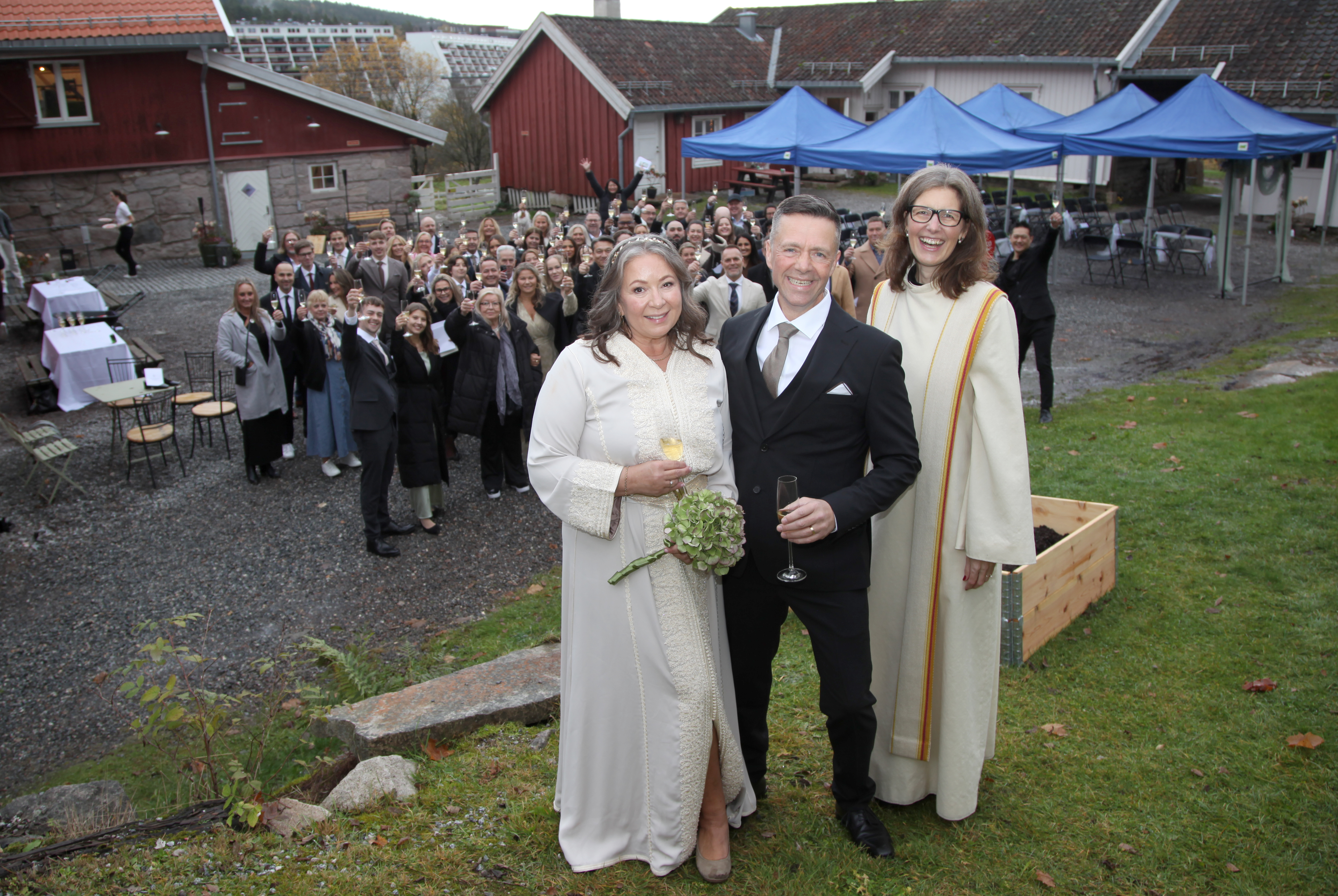 FULL JUBEL: Alle hevet glasset for brudeparet Ann Suade Garcia og Torbjørn Spaberg da de som de første i historien ble viet på gårdstunet til Bånkall gård. Prest Tone Marie Falch i Grorud menighet er glad for at hun fikk presteoppgaven i forbindelse med begivenheten. FOTO: Rolf E. WulffBilde 1 av 12