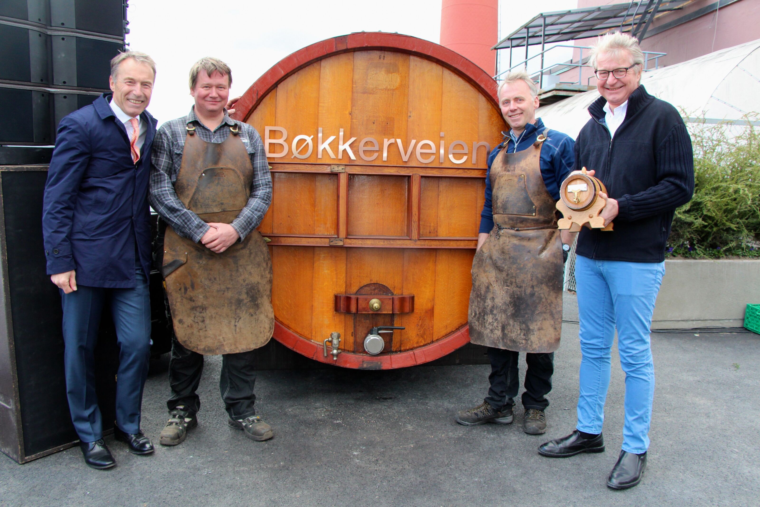 7000 LITER: Bøkkerveien utsmykkes her med tomtas historie i form av en brennevinstønne. Her står direktør Erik Lund i Höegh Eiendom (f.v), bøkkerne Ole Olsen og Arne Jøran Øyen, samt ordfører Fabian Stang (H). (Fotos: Caroline Bremer). Foto:Bilde 1 av 3